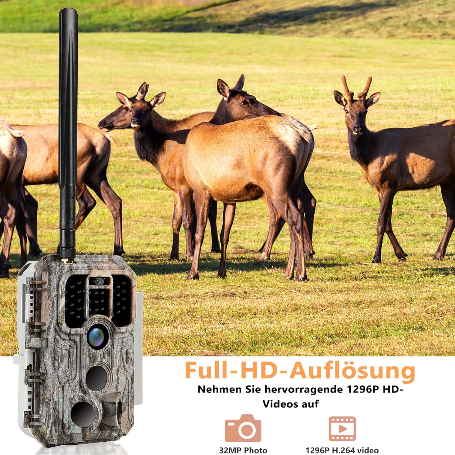- Lieferumfang: Wildkamera mit eingebautem Mobilfunkmodul, LTE-Antenne, SIM-Karte, 32 GB Speicherkarte, Befestigungsgurt, Antenne, USB-Kabel, englisch/deutsche Bedienungsanleitung.