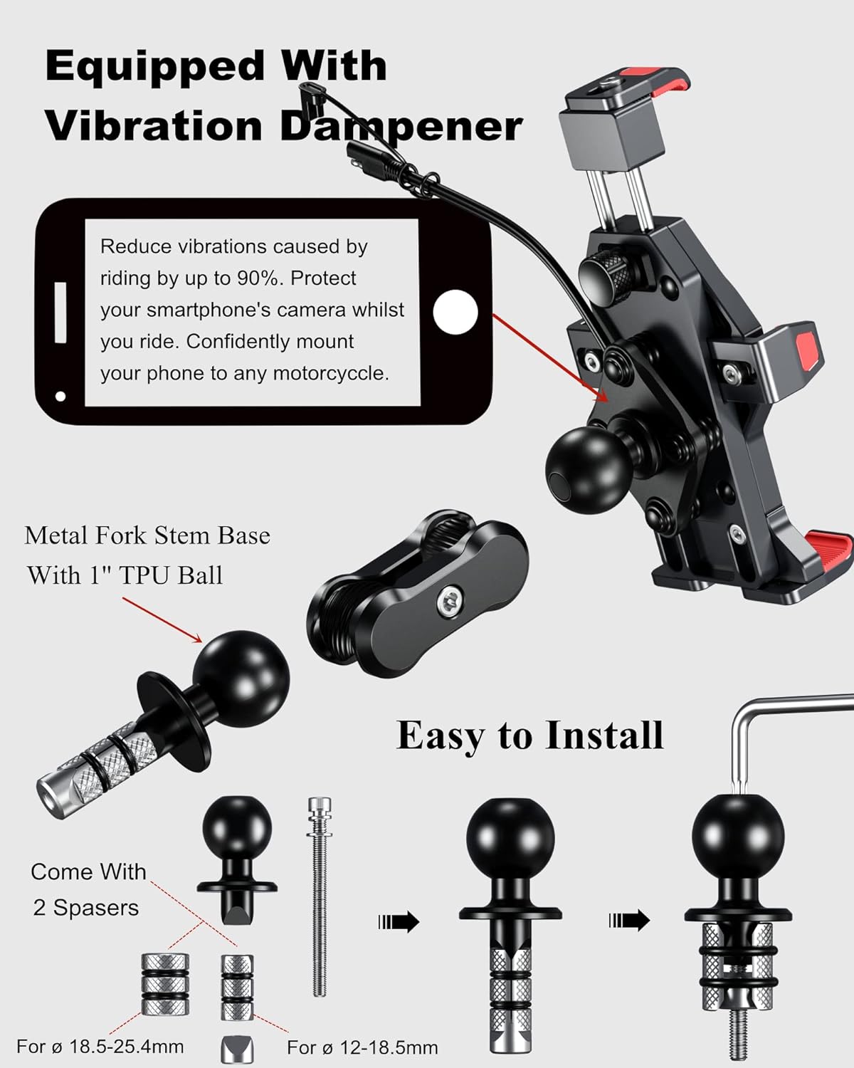 - [ Einfach zu installieren ] Das im Lieferumfang enthaltene Zubehör ermöglicht die einfache Befestigung dieser Handyhalterung am Gabelschaft des Motorrads. Die 1-Zoll-Kugelbasis passt in die zylindrische oder sechseckige Bohrungswand des