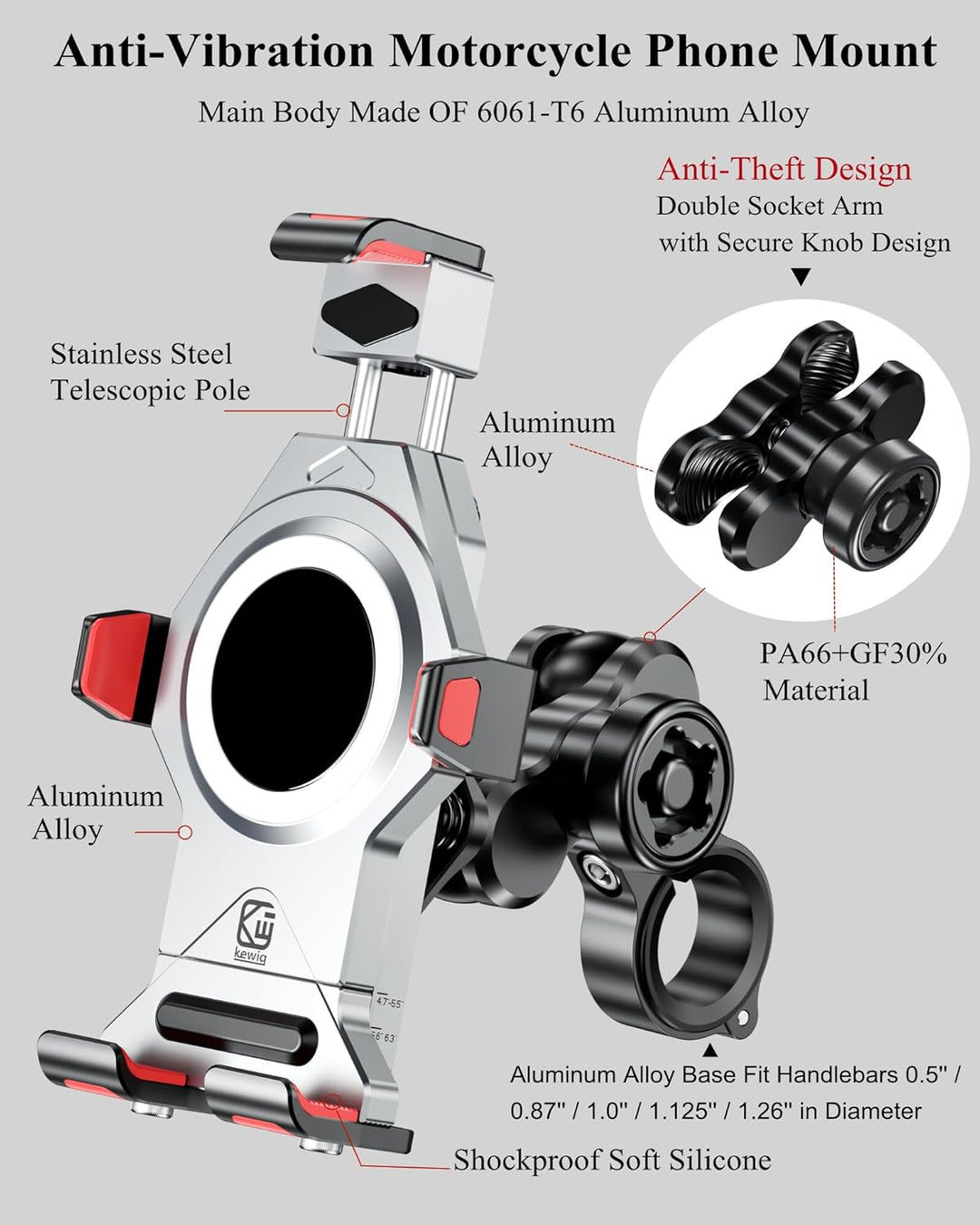 - [Design des schützenden Telefonhalters] Dieses Motorrad-Telefonhalter-Set ist mit einer Lenkerhalterung aus Aluminiumlegierung und einem Kugelklemmarm aus Aluminiumlegierung konfiguriert. Der Kugelklemmarm aus Aluminiumlegierung ist mit einem