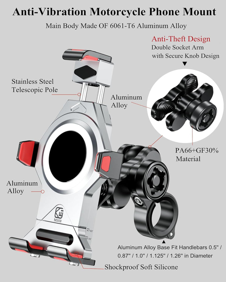 - [Einfach zu installieren] Das im Lieferumfang enthaltene Zubehör ermöglicht die einfache Befestigung dieser Handyhalterung am Lenker und Rückspiegel. Die Lenkerhalterung für Motorradtelefonhalter ist für Lenker mit einem Durchmesser von 0,5 Zoll (12