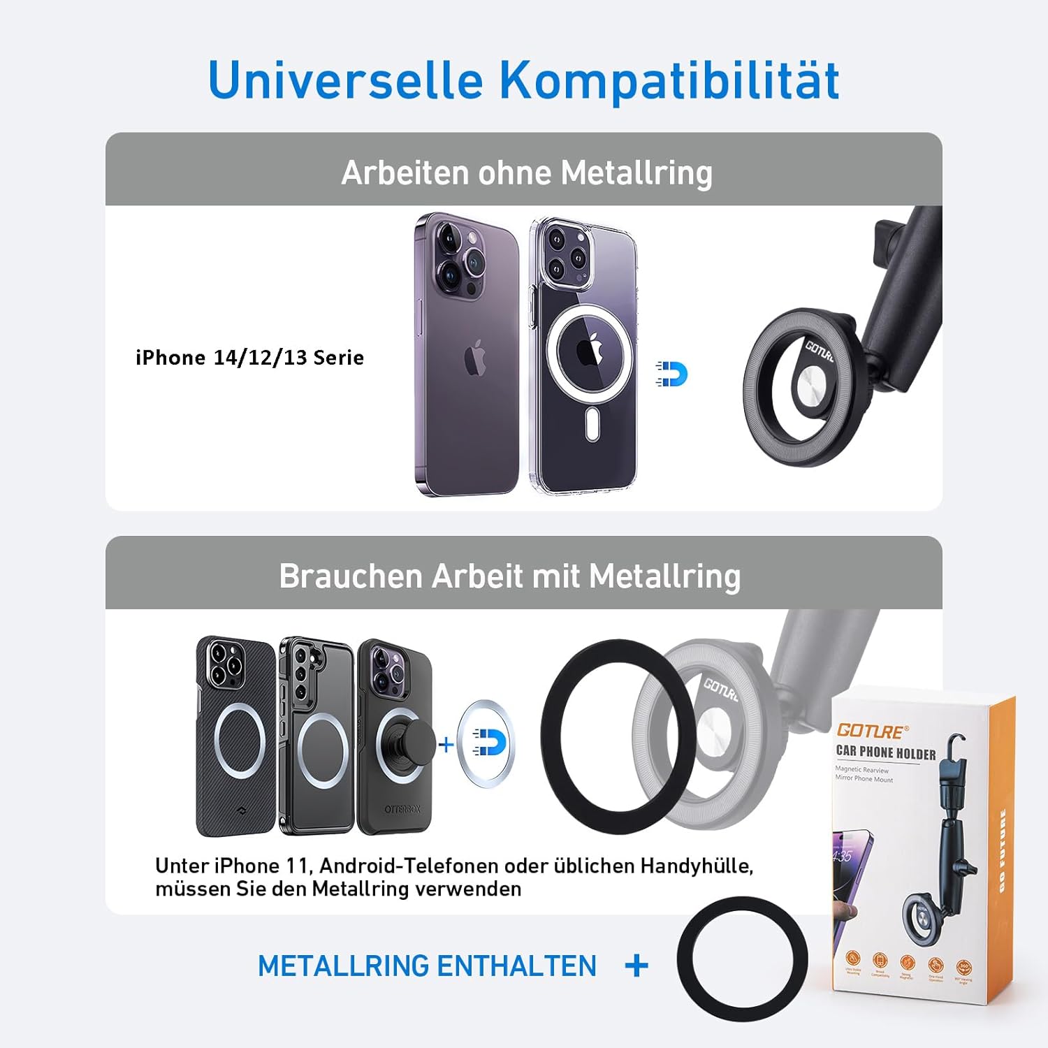 - 【 Automatisch】360°-Magnetring für die magnetische Telefonhalterung richtet sich automatisch auf das Magnetsystem der iPhone 14 13 12 Serie aus, um eine einfache Befestigung mit nur einer Berührung zu ermöglichen. Es ist kein zusätzlicher