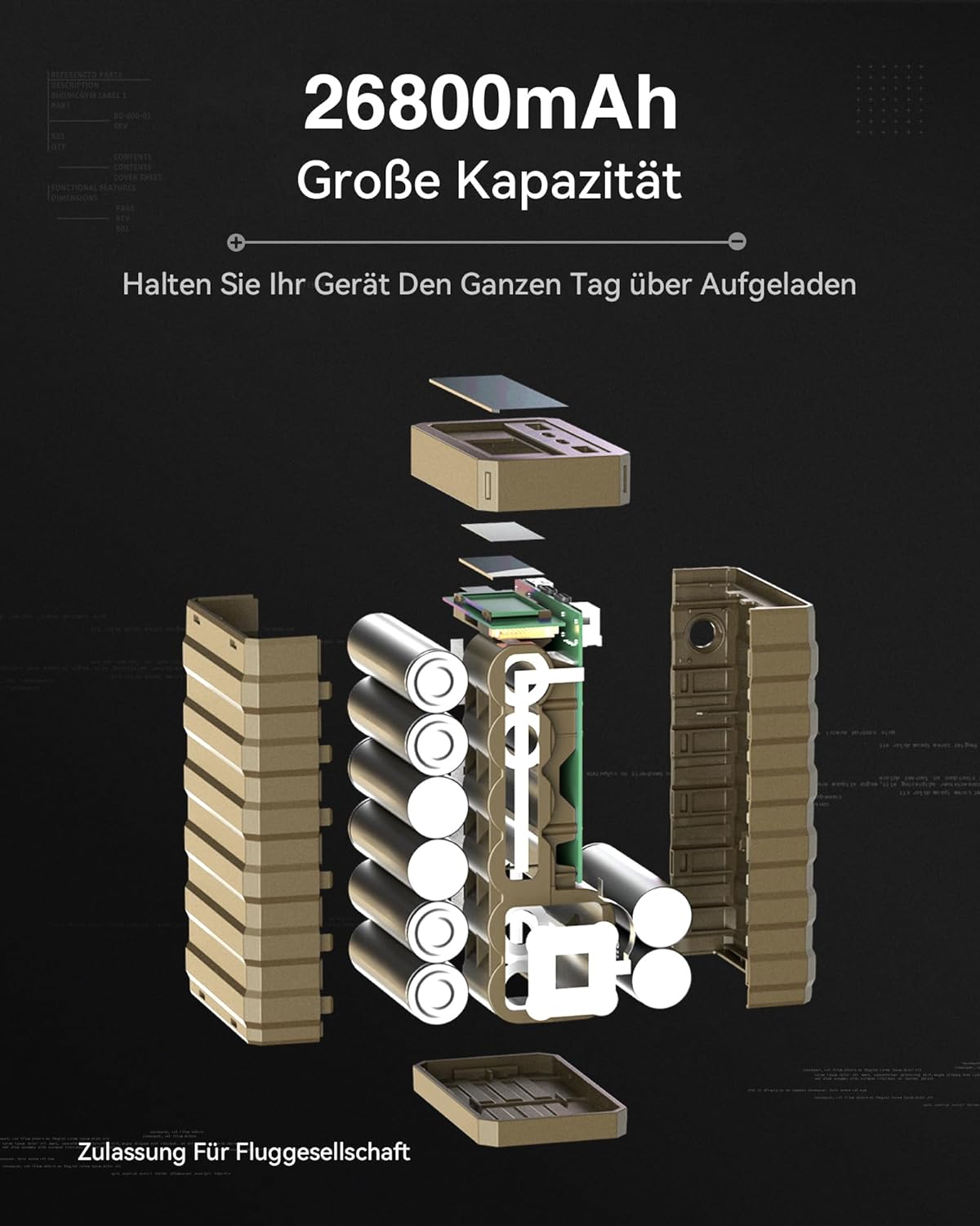- ăGrosse KapazitĂ€tă: Tragbare Powerbank mit grosser KapazitĂ€t von 26800 mAh bietet langanhaltende Energie fĂŒr Ihre mobilen GerĂ€te wie Mobiltelefone, Tablets, Laptops usw. WĂ€hrend langer Reisen oder GeschĂ€ftsreisen ohne Angst zu haben, dass das