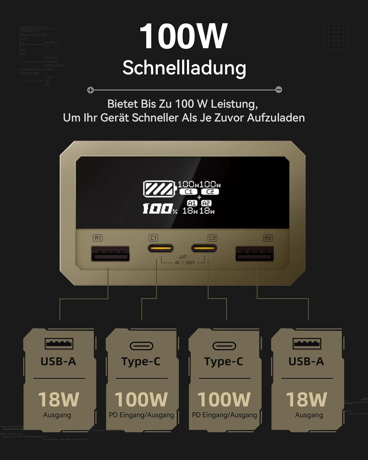 - ăIntelligentes OLED-Displayă: Diese 100-W-Powerbank ist mit einer gut lesbaren Digitalanzeige ausgestattet, die die Ausgangs- und Eingangsleistung sowie die geschĂ€tzte Zeit anzeigt, die zum vollstĂ€ndigen Aufladen benötigt wird.