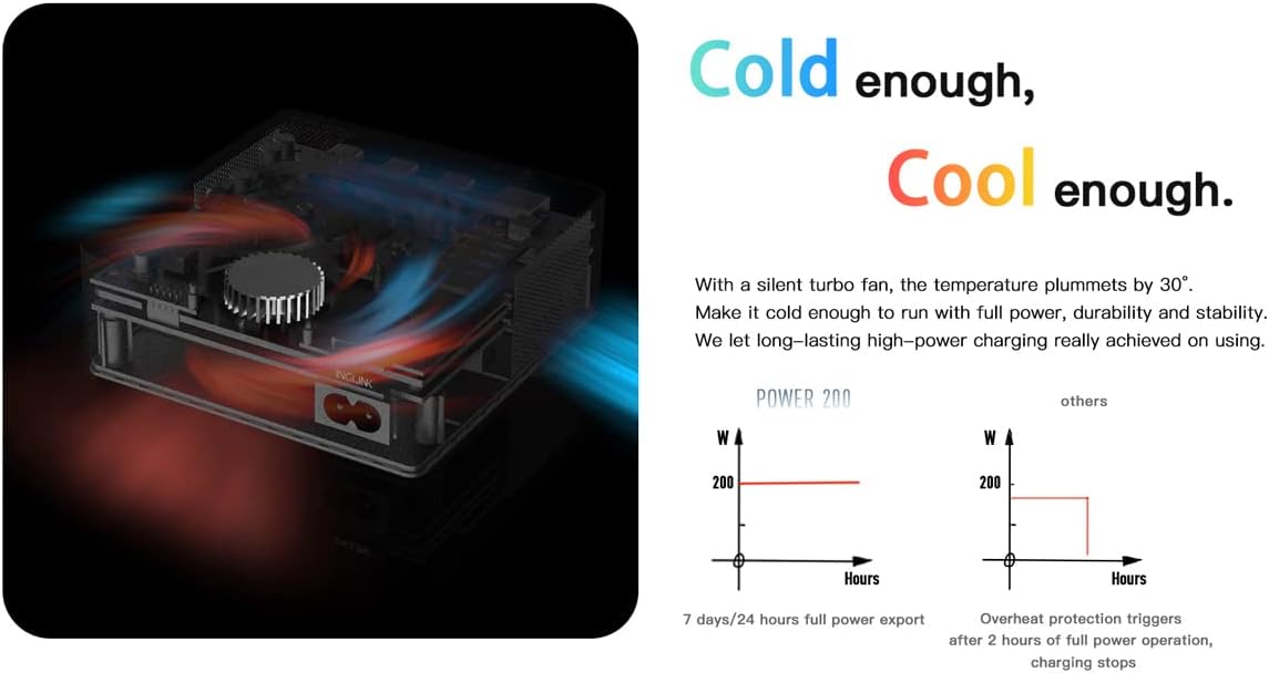 - ⚡⚡【Cool Enough, Power Enough】: Mit einem leisen Turbolüfter sinkt die Temperatur um 30°. Machen Sie es kalt genug, um mit voller Leistung, Haltbarkeit und Stabilität zu laufen. Wir lassen eine lang anhaltende Hochleistungsladung wirklich bei