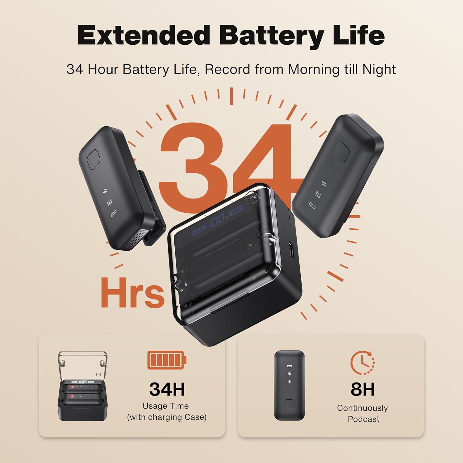 - [42-Stunden-Akku & Sicher-Ladecase] Mit 5-fach längerer Laufzeit (42h Gesamtbetrieb) übertrifft es herkömmliche Funkmikrofone. Das kompakte Case zeigt Echtzeit-Akkustände an, schützt die Mikrofone und lädt sie unterwegs – kein Teilverlust oder