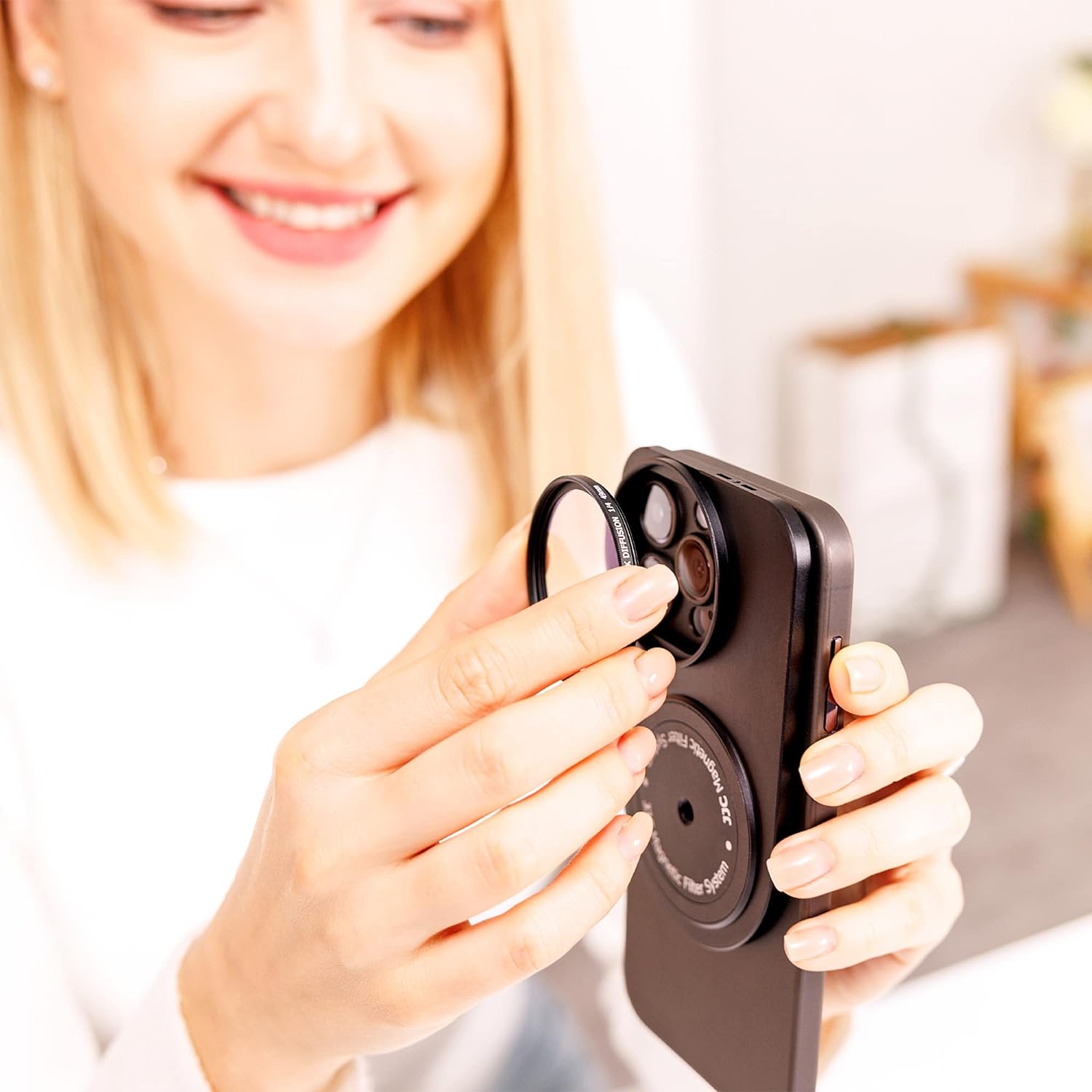 - JJC Handy-Filterhalterung: Das Set besteht aus einer magnetischen Handyhülle und einem Filter-Halterungssystem, das speziell für iPhone 14 Pro Max entworfen wurde, um jeden 49-mm-Filter mit Gewinde zu montieren. Sehr vielseitig und einfach zu bedienen,
