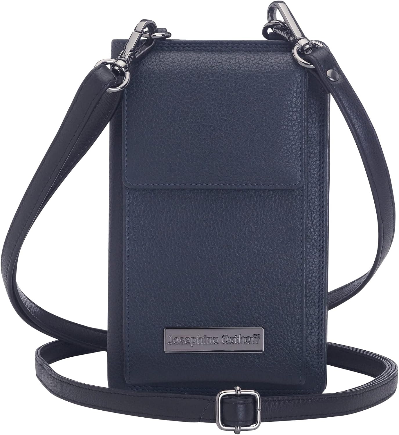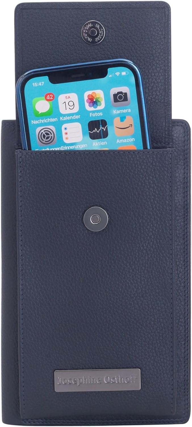 PRODUKTBESCHREIBUNGEN Josephine Osthoff Handytasche & Geldbörse aus Leder (102) - handgefertigtes Unikat - weiches Echtleder - designed in Deutschland - Handyfach bis 7 Zoll - RFID Sicherheitsgewebe zum Schutz ihrer Daten Ein Einzelstück aus geschmeidigem Echtleder und in hochwertiger Handarbeit im klassisch-elegantem Design. Mit der edlen Optik des Leders und dem Innenfutter ist die Handytasche zeitlos elegant. Damit immer an alles gedacht ist, überzeugt die Mobilfunktasche durch eine zeitgemässe Anzahl an Kartenfächern. Dank integriertem RFID Blocker steht zudem Ihre Sicherheit beim Bezahlen an erster Stelle und das Auslesen Ihrer Daten von EC-Karten, Kreditkarten, Kundenkarten oder Ausweisen wird verhindert. Machen Sie sich keine Gedanken mehr über Datendiebstahl und heimliches Auslesen Ihrer Karten! neue Version: Ringfeder-Druckknöpfe statt Anorak-Druckknöpfe, für besonders sicheren Halt! Ausstattung: Handyfach für Mobiltelefon bis max. Höhe 16,4 cm und max. Breite 10,0 cm, rückseitig Münzfach mit Reissverschluss, 2 Geldscheinfächer, 2 Sichtfächer, 10 Kartenfächer, 4 Steckfächer, durchdachtes Design: Smartphonetasche und Geldbörse in einem, extra stabiler Druckknopf-Verschluss Abmessung: Handyfach 16,4 x 10 x 3 cm, Gewicht: 224 Grammi deales Geschenk: Passend für jeden Anlass. Der ideale Begleiter für Beruf, Alltag und Freizeit! Qualität: hochwertige moderne Smartphonetasche aus weichem Echtleder mit Doppelnaht in kleinen Serien in Handarbeit gefertigt Sicherheit: Zum Schutz vor Datendiebstahl wurde ein sicheres RIFD Safegewebe eingenäht Deutsches Design und deutscher Kundendienst: Wir lieben Leder. Unsere Produkte werden in hochwertiger Handarbeit und in kleinen Serien gefertigt. Alle Produkte sind im Design und ihrer Funktionalität durchdacht. Wir verwenden ausschliesslich 100% Echtleder. Kontaktieren Sie uns bei Fragen und Problemen, wir sind für Sie da
