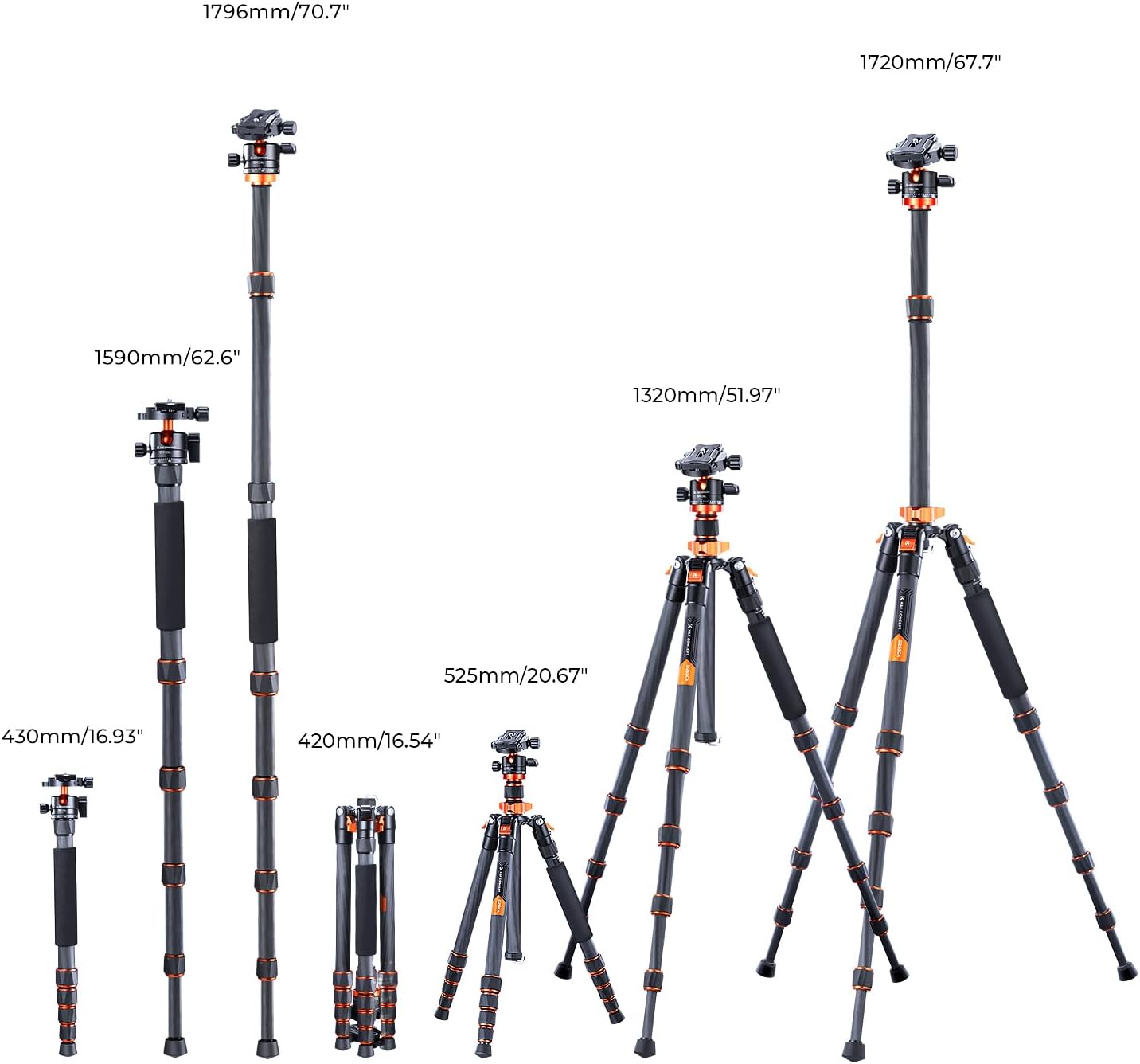 - 【Kompakt und Tragbar】Das Carbon Stativ mit Kugelkopf wiegt nur 1.37KG. Zum Transport lassen sich die Stativbeine um 180 Grad klappen, was das Packmass auf nur 42 cm reduziert! Das ideale K&F Concept Carbon Stativ ist auf Reise.