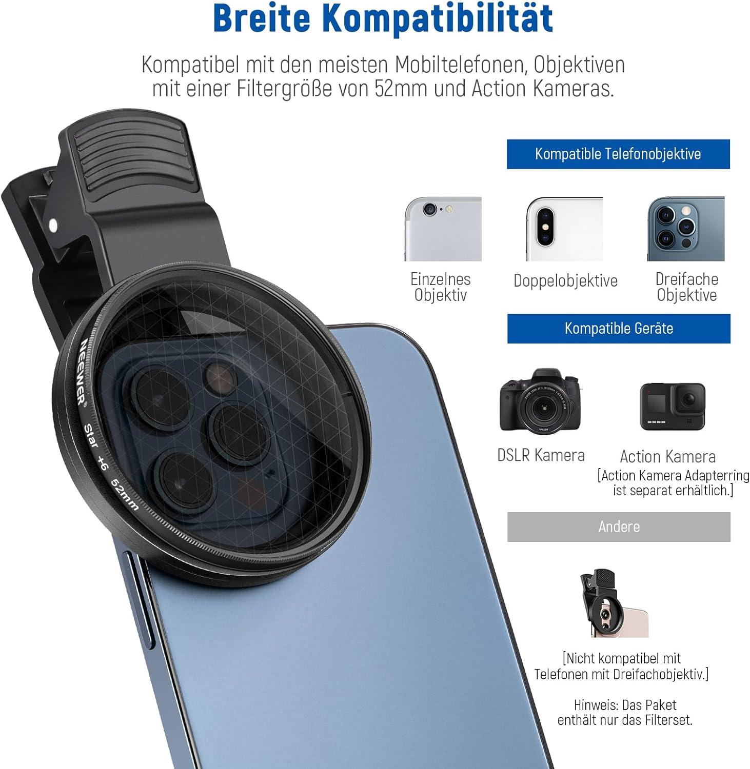 - 【Filterset für Telefonkameraobjektive】 Dieses 52mm Filterset enthält 4 abgestufte Farbfilter (rot, orange, gelb und blau), einen CPL Filter, einen ND32 Filter, einen 6 Punkt Sternfilter und eine Telefonobjektivklammer, welche sogar auf die meisten