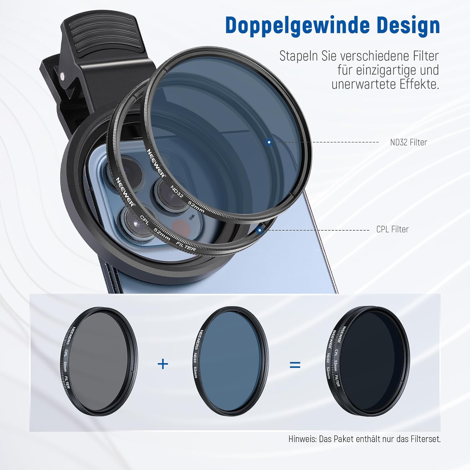 - 【Neutraldichtefilter】 Der ND32 Filter reduziert das in den Kamerasensor eintretende Licht um 5 Stufen, ohne die Farbe zu ändern. Sie können eine längere Verschlusszeit für kreative Fotos oder eine grössere Blende für eine geringere