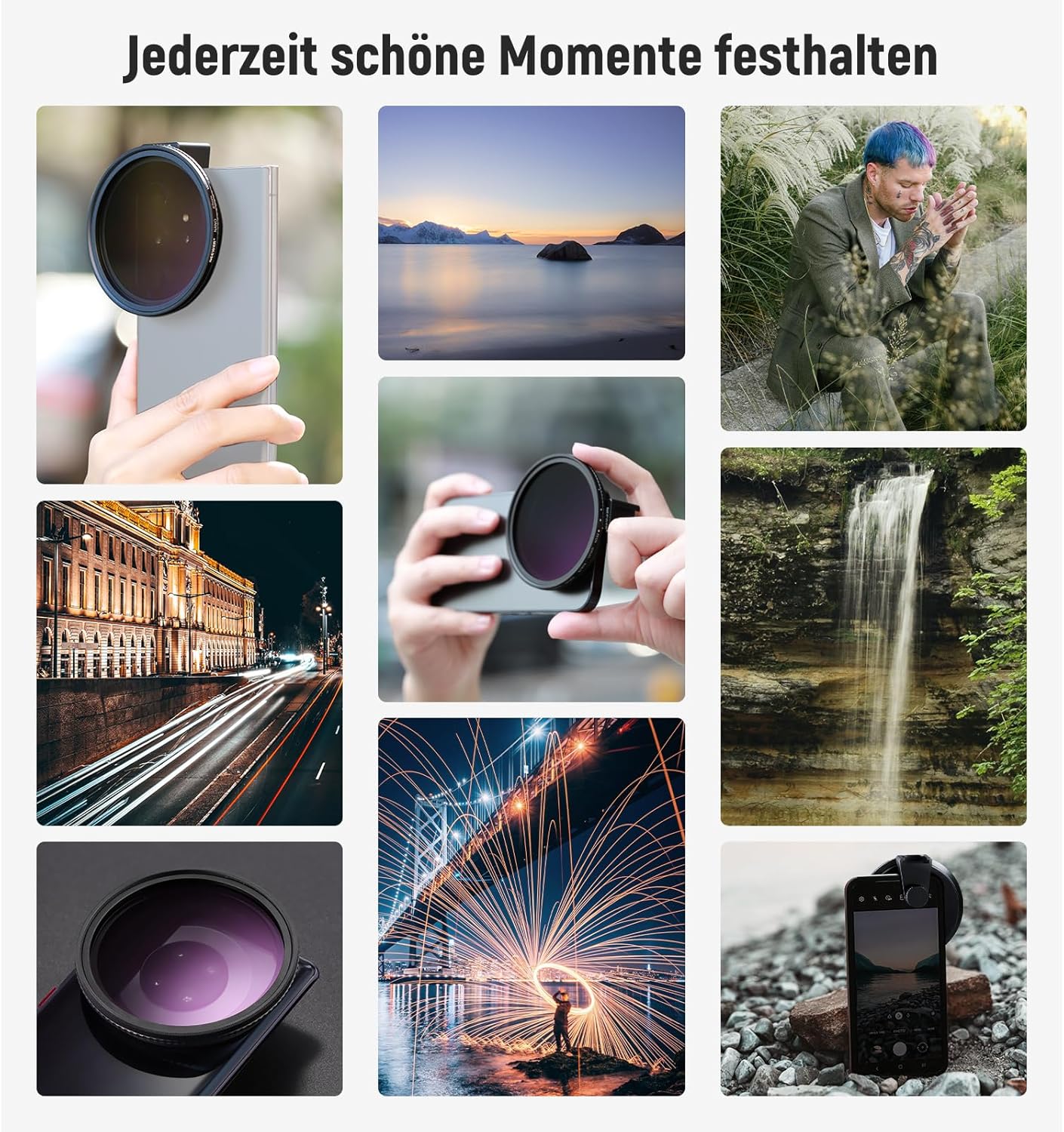 - Vielseitige Lösung für Handyaufnahmen: Das 67 mm variable ND Filter Set zum Aufstecken für Handyobjektive ist Ihre mobile Fotografie mit einem universellen Gewindefilteradapterring und präziser Lichtreduzierungssteuerung zu verbessern. Kompatibel mit