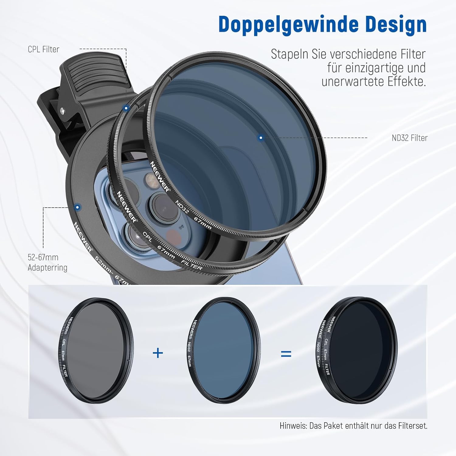 - 【Filterset für Telefonkameraobjektive】 Dieses 67mm Filterset enthält 4 abgestufte Farbfilter (rot, orange, gelb und blau), einen CPL Filter, einen ND32 Filter, einen 6 Punkt Sternfilter und eine Telefonobjektivklammer, welche sogar auf die meisten