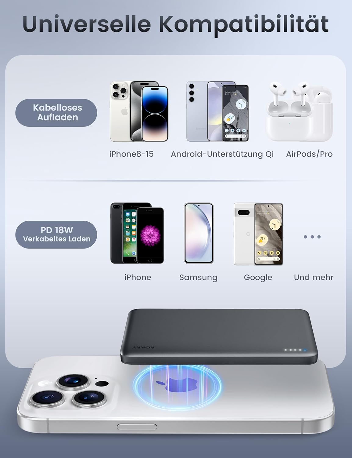 - Kabellose Freiheit: Verabschieden Sie sich von verworrenen Kabeln und Port-Probleme. Verbinden Sie Ihr iPhone kompatibel mit Magsafe oder andere Smartphones nahtlos mit dem RORRY Dünn Power Bank und geniessen Sie eine robuste, aber sanfte Magnetbindung