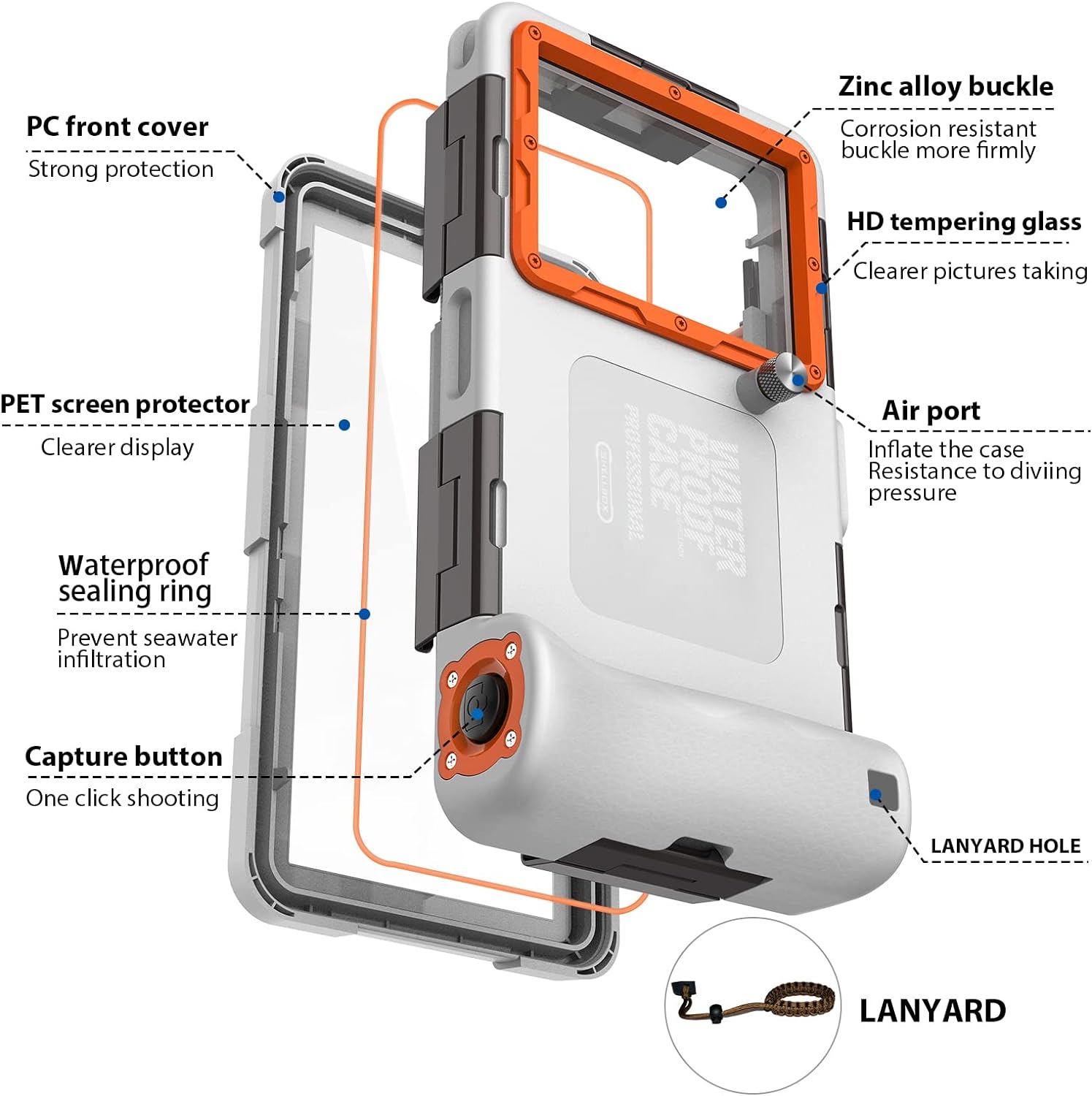 - Schnelleinrichtung: Setzen Sie Ihr Telefon ein und schliessen Sie den Koffer. Alles was Sie tun müssen,ist die Kamera oder das Video einzuschalten, bevor Sie unter Wasser sind. Das wasserdichte Gehäuse hat ein "Shutter" -Design. Um alle Details Ihres