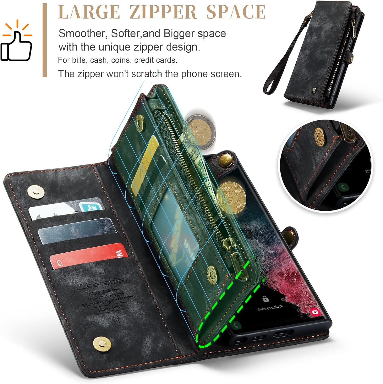 - 【 HINZUGEFÜGTER HANDSCHLAUFE EXQUISITES DESIGN 】 - Es besteht aus hochwertigem doppellagigem Leder und alle. Es hat ein leicht gleitendes Retro-Reissverschluss-Design und liegt gut in der Hand. Präzise Öffnung für eine perfekte Passform. Es