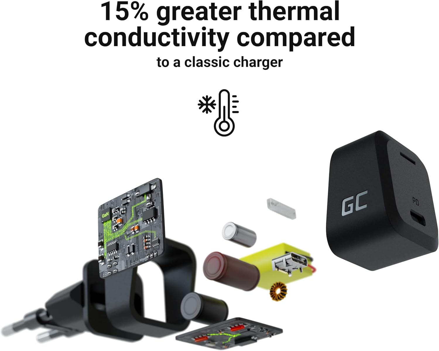 - Modern und absolut sicher GC PowerGaN verwendet Galliumnitrid, das sich während des Ladevorgangs im Vergleich zu herkömmlichen Ladegeräten deutlich weniger erwärmt, was sich direkt auf die Sicherheit und die Ladeleistung auswirkt.