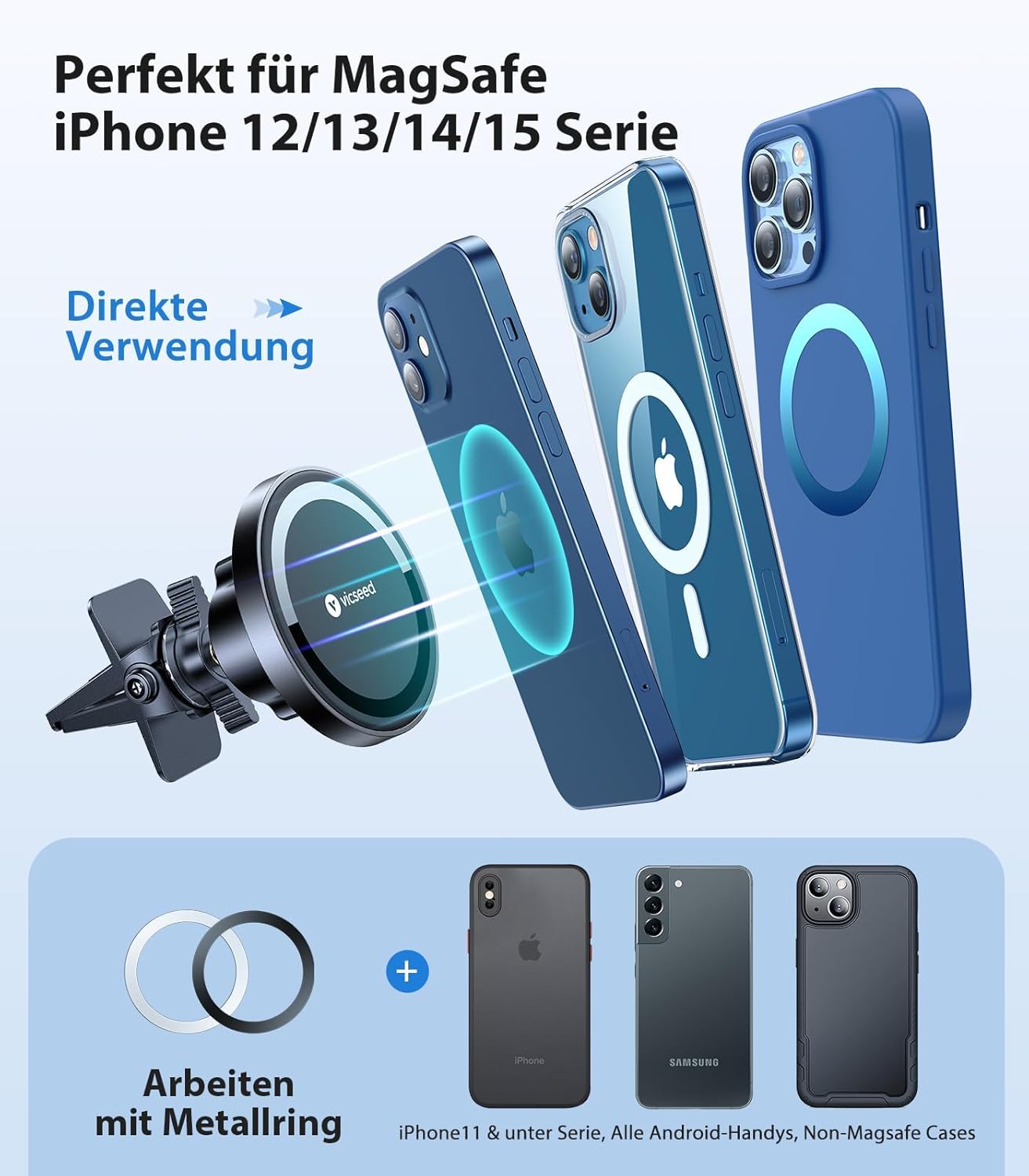 - ✅【KOMPATIBEL MIT ALLEN SMARTPHONES】Dieser Magasfe autohalterung ist für alle Handys geeignet. Handy mit Magsafe-Funktion können direkt verwendet werden, andere Handys sollten mit Metallringen verwendet werden. (Wir bieten drei Metallring mit rückseitigem 3M Klebeband für Ihre elektronischen Geräte. Die dünne Metallring dient dazu sich mit dem Magneten zu verbinden. Diese passt auch hinter die Schutzhülle Ihres Telefons und ist im Alltag nicht sichtbar. )