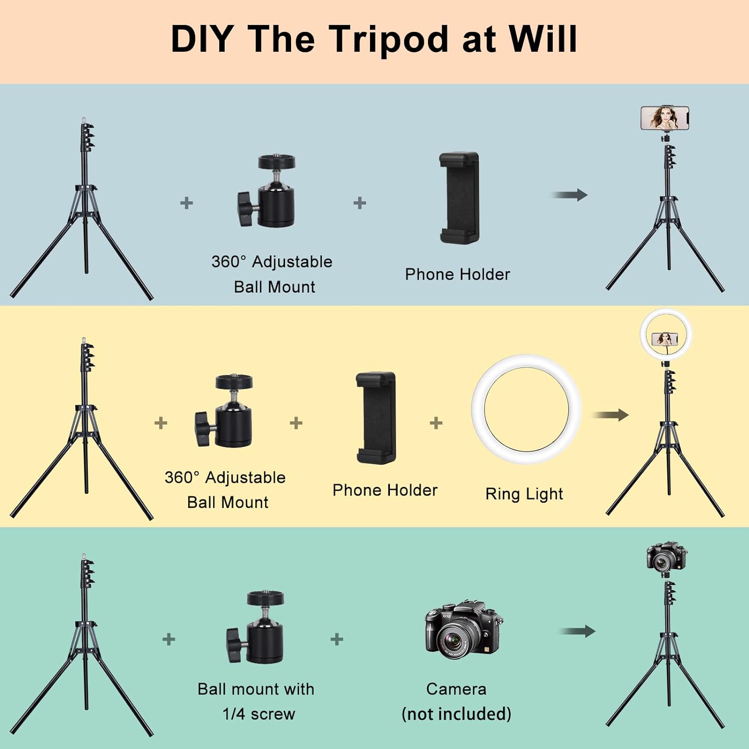 - 🌟【Stativ & Mini-Tischständer】 Das Bodenringlicht-Stativ und das Tischringlicht-Mini-Tischstativ können verwendet werden, um ein Ringlicht, ein Mobiltelefon (mit 1 horizontalen Telefonhalterung) oder eine Kamera separat zu befestigen. Der