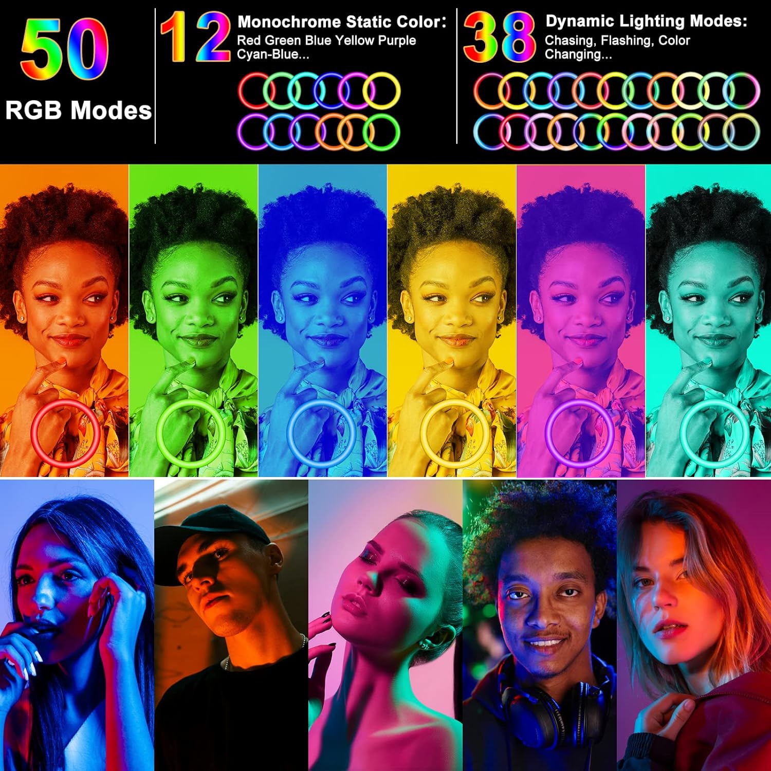- 🌈【50 RGB-Farben】 Mit der RGB-LED-Funktion können Sie das Selfie-Ringlicht auf statische Farben wie Rot, Grün, Gelb, Blau und Violett sowie auf andere dynamische Farbwechselbeleuchtungsmodi einstellen. Sie können auch die Geschwindigkeit des
