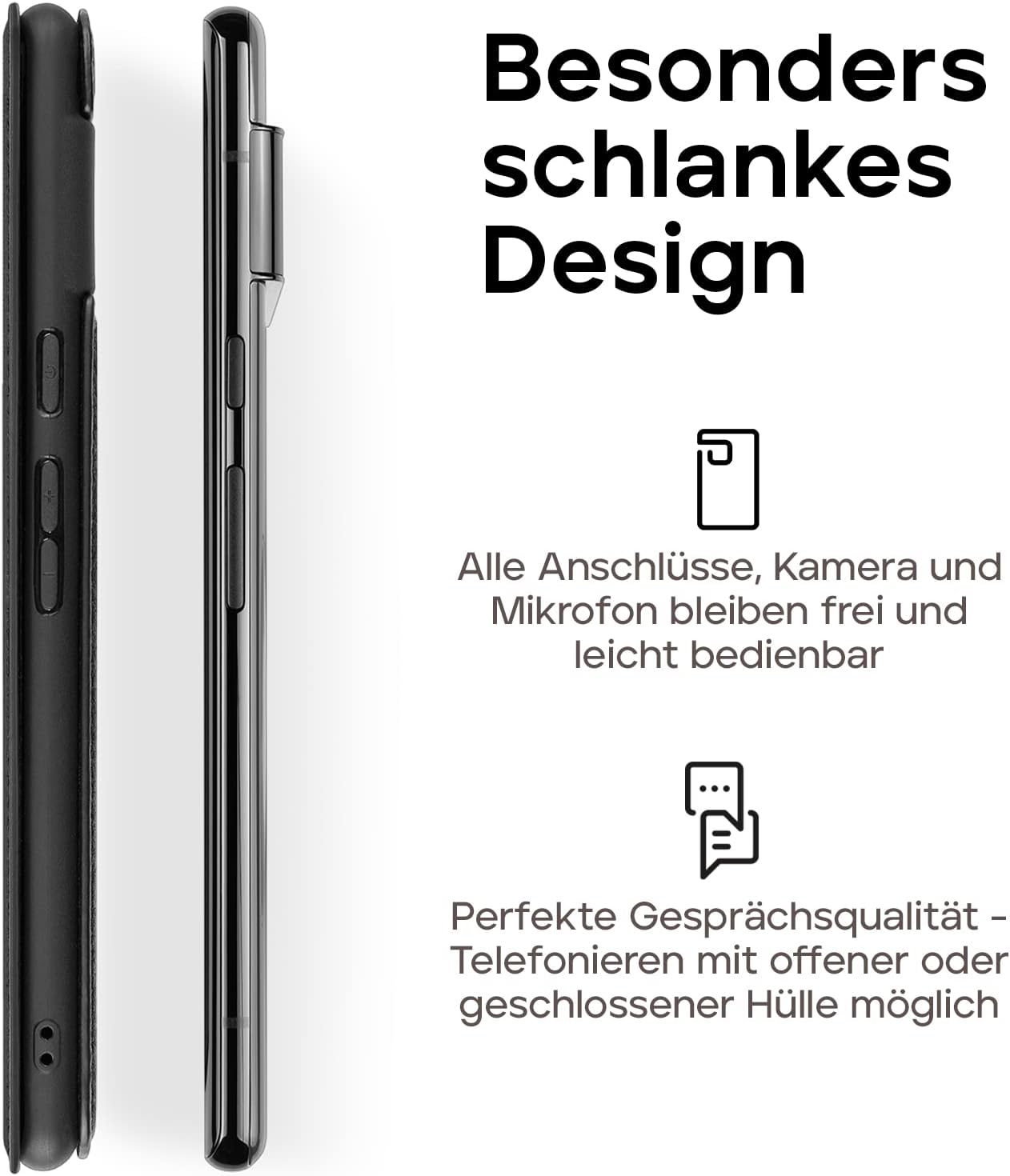 - SCHLANKES & PRAKTISCHES DESIGN: 1 Steckfach für Visitenkarten, Kreditkarten, Ausweise oder Geldscheine. Nützliche Standfunktion zum bequemen und entspannten Videos und Fotos schauen. Sie können das Smartphone hierfür ganz einfach im Querformat