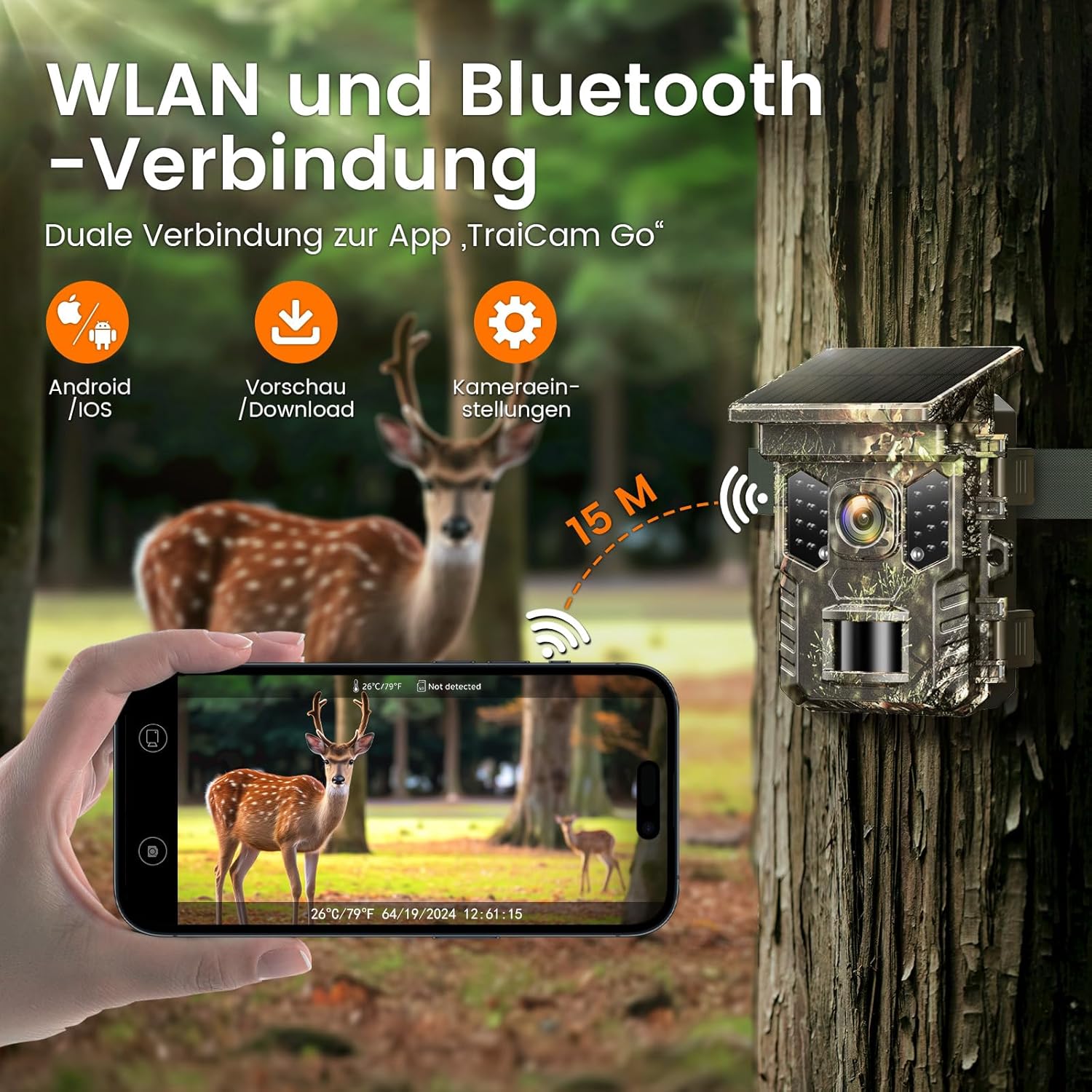 - WLAN-Verbindung und Einfach-Dateifreigabe:Laden Sie die „TrailCam Go“-App herunter und verbinden Sie die App manuell mit den integrierten WLAN- und Bluetooth Ihrer Wildkamera.Dann können Sie Vidoes direkt in der App anzeigen und auf Ihr Telefon