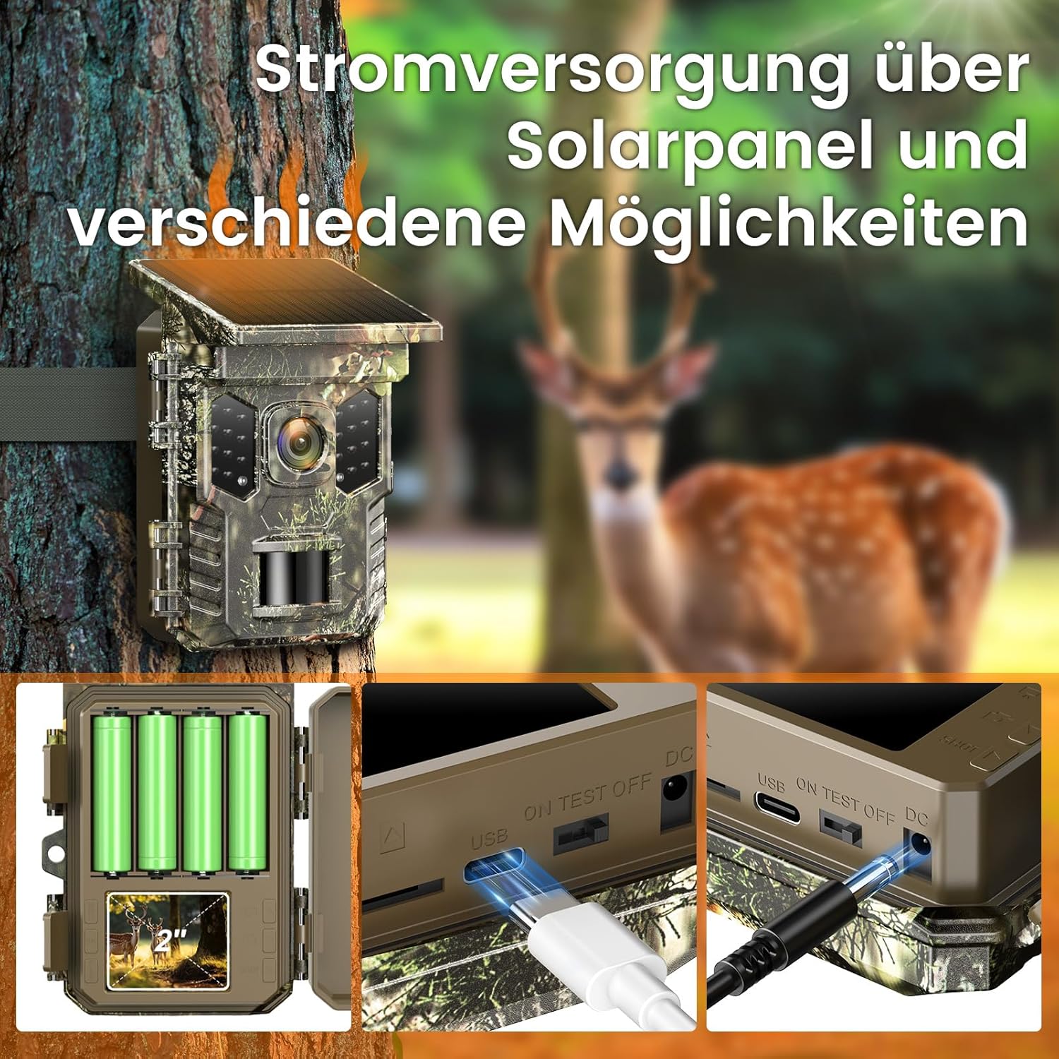 - Solar-Doppelstromversorgung: Diese Solar Wildkamera mit Handyübertragung App verfügt über eingebaute 2600mAh-Lithiumbatterie, die über ein oben angebrachtes Solarpanel mit Strom versorgt werden kann. Dies reduziert den AA-Batterieverbrauch und schont