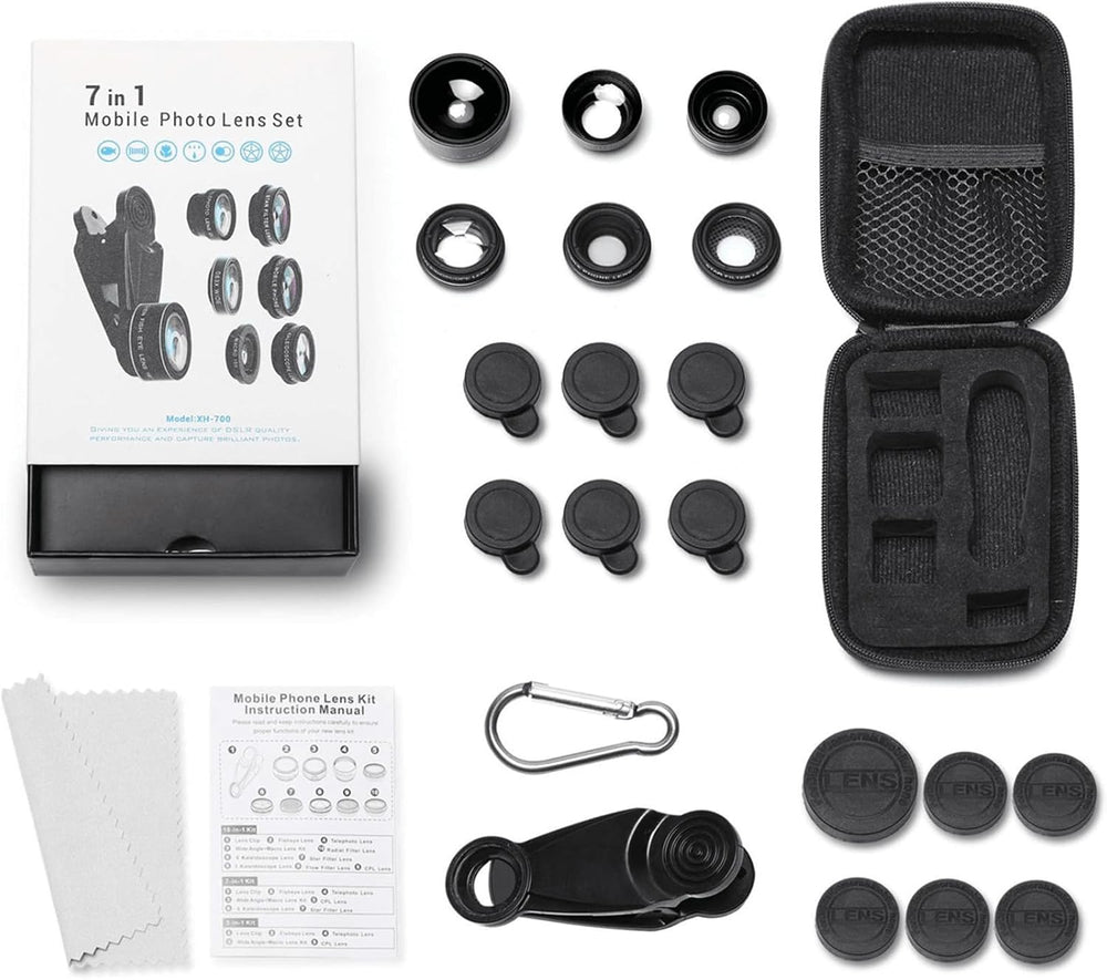 7-in-1-Objektiv-Set für Handy, HD Fisheye, Weitwinkel 0,63 x, Makro 15 x, Porträtobjektiv, 2 x Polar