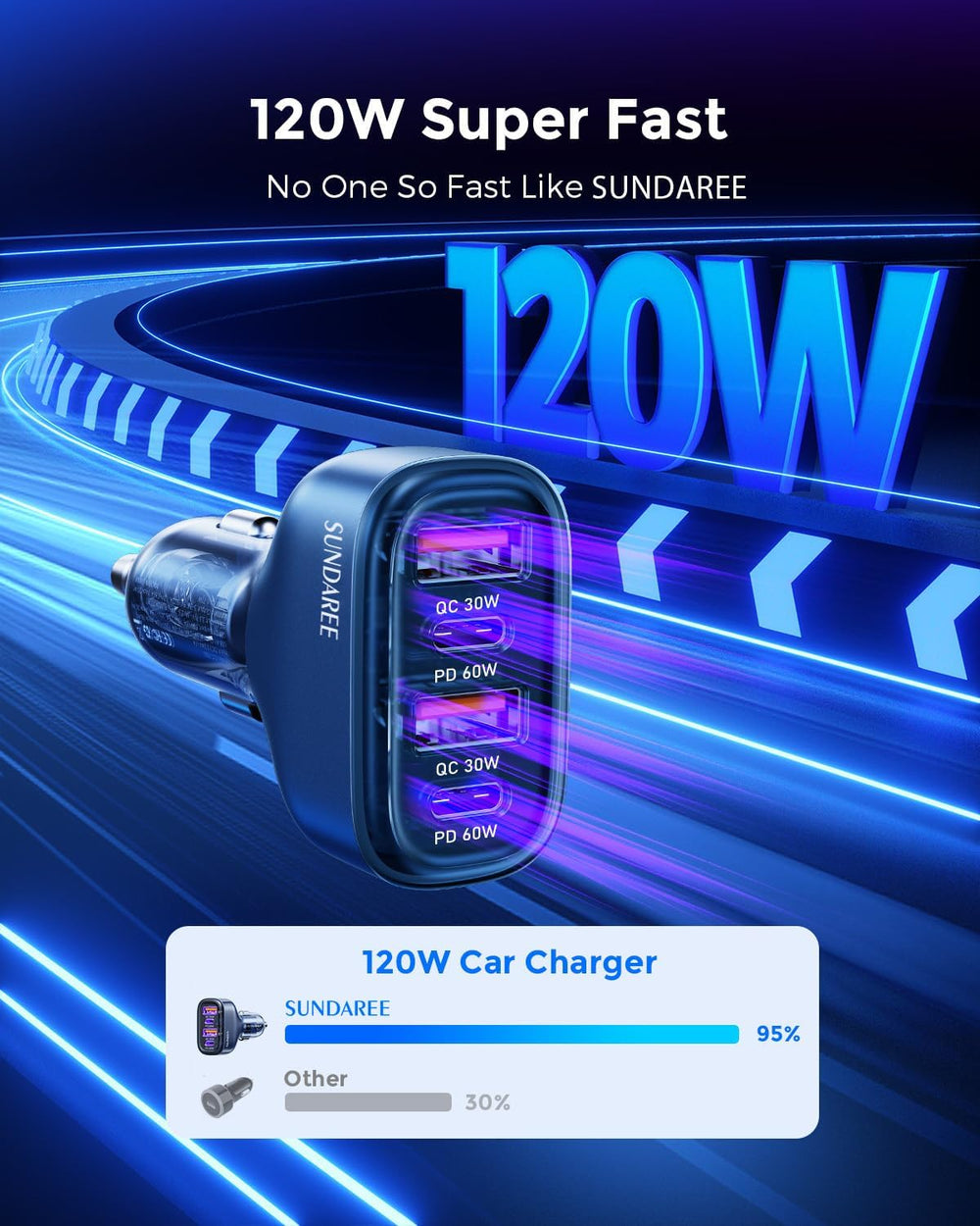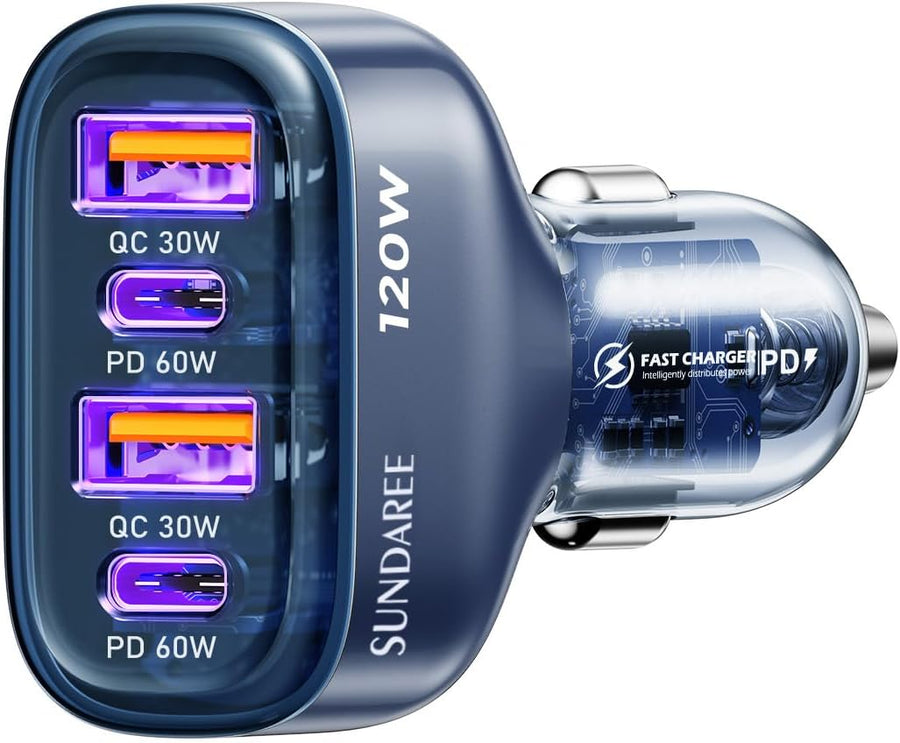 SUNDAREE Zigarettenanzünder USB C,120W 4 Port 12V 24V Kfz Handy Auto Ladegeräte Type C PD QC 4fach S