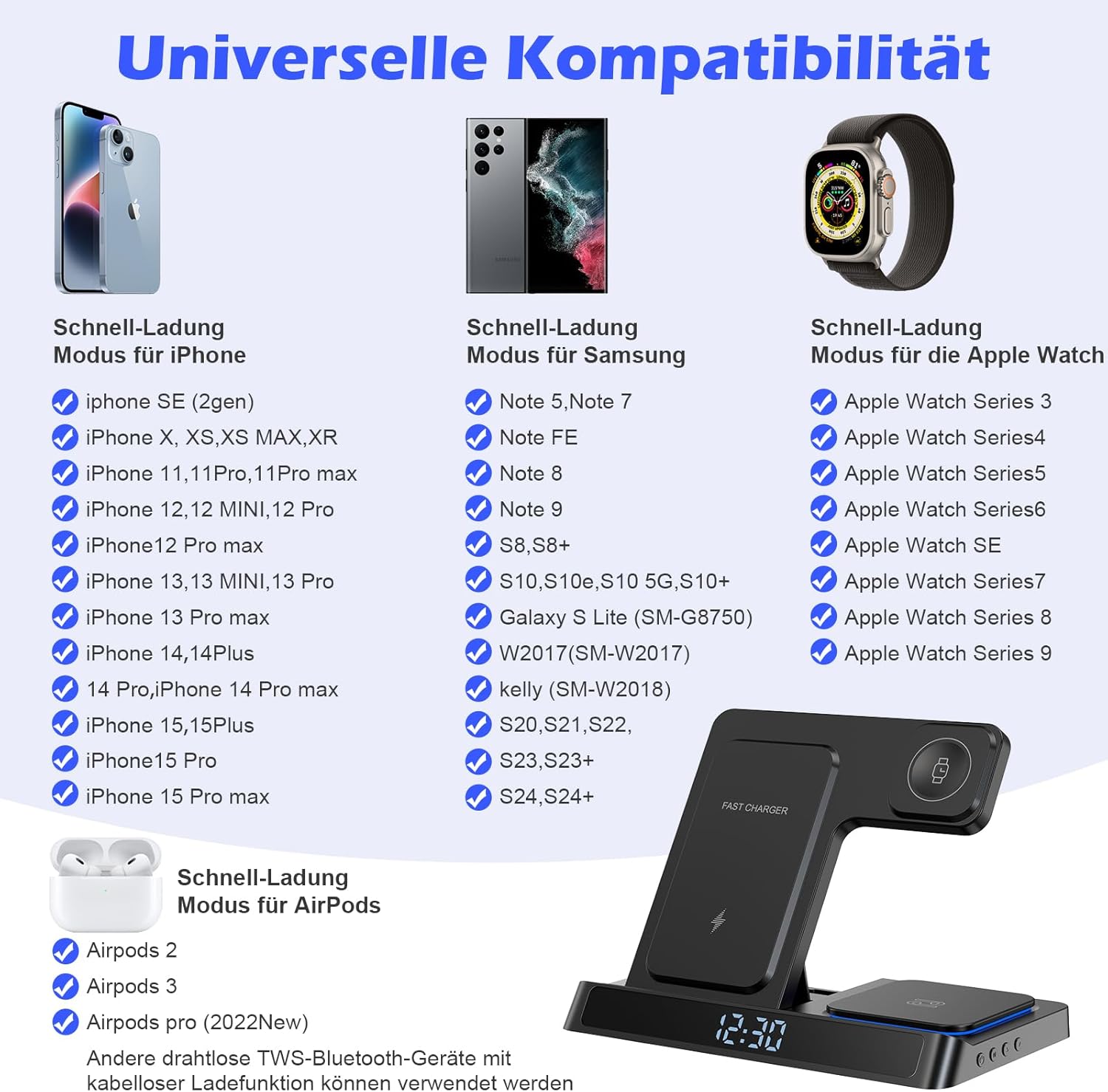 - 【Wireless Charger mit QC 3.0-Adapter】Die induktive ladestation unterstützt die meisten Handys mit kabelloser Ladefunktion nach Standard.4 in 1 ladestation kompatibel für iPhone 15/15 Plus/15 Pro/15 Pro max/14/14 Plus/14 Pro/14 Pro Max/13/13 Pro/13