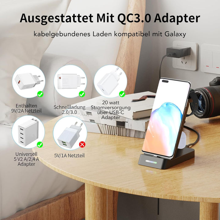 - 【Schnell und sicheres Ladegerät】Diese Verkabelt Samsung Ladestation iWatch und Telefon-Ladegerät bietet Überstrom, Überspannung, Kurzschluss und Überhitzungsschutz. Diese können Ihr Gerät während des Lebens schützen. Der QC3.0 (9V 2A)