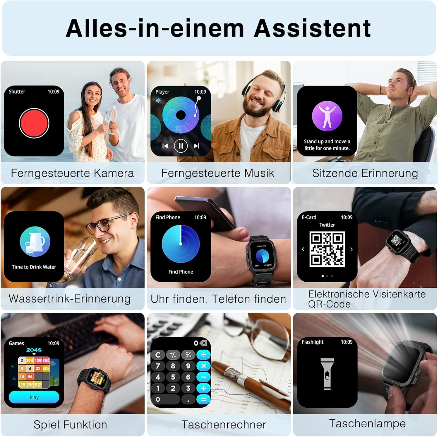 - 【Multifunktionaler Assistent】Die Bebinca Herren-Smartwatch unterstützt Wettervorhersage, Kamerasteuerung, Musiksteuerung, Atemtraining, Timer/Wecker/Stoppuhr, physiologisches Zyklustracking, Weltzeituhr, Handyfinder, Taschenrechner, Erinnerung an