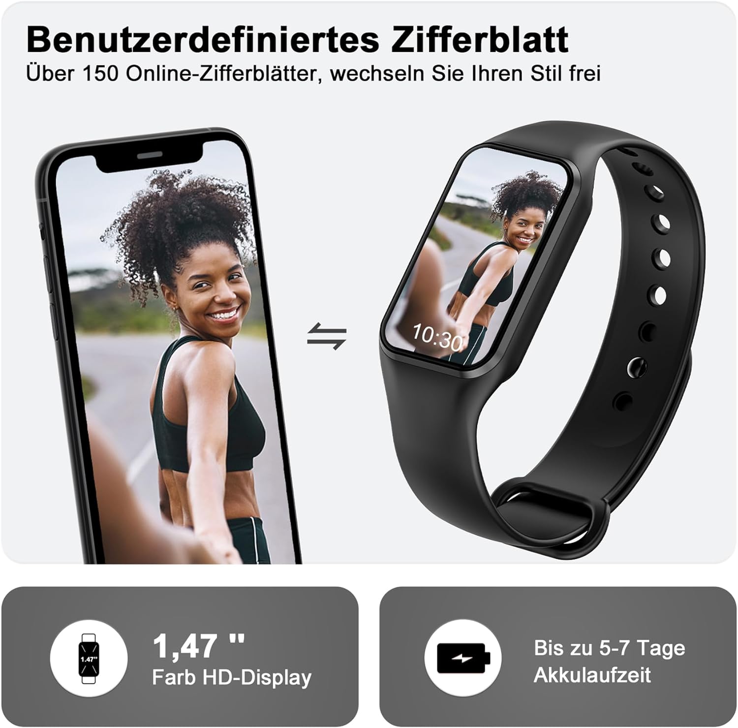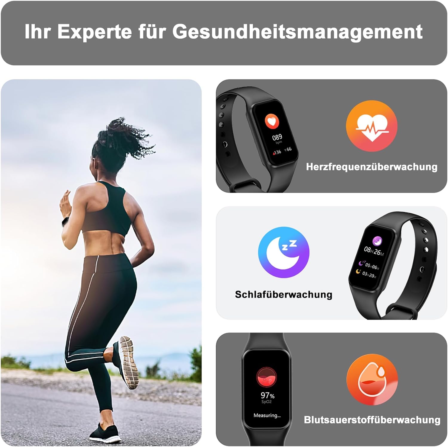 - 【Gesundheitsdatenüberwachung】Die Fitnessuhr verfügt über einen integrierten optischen Tracking-Sensor, der automatisch Ihre Herzfrequenz und Ihren Blutsauerstoff 24 Stunden am Tag Intermittierend überwacht und nachts Ihren Schlafstatus