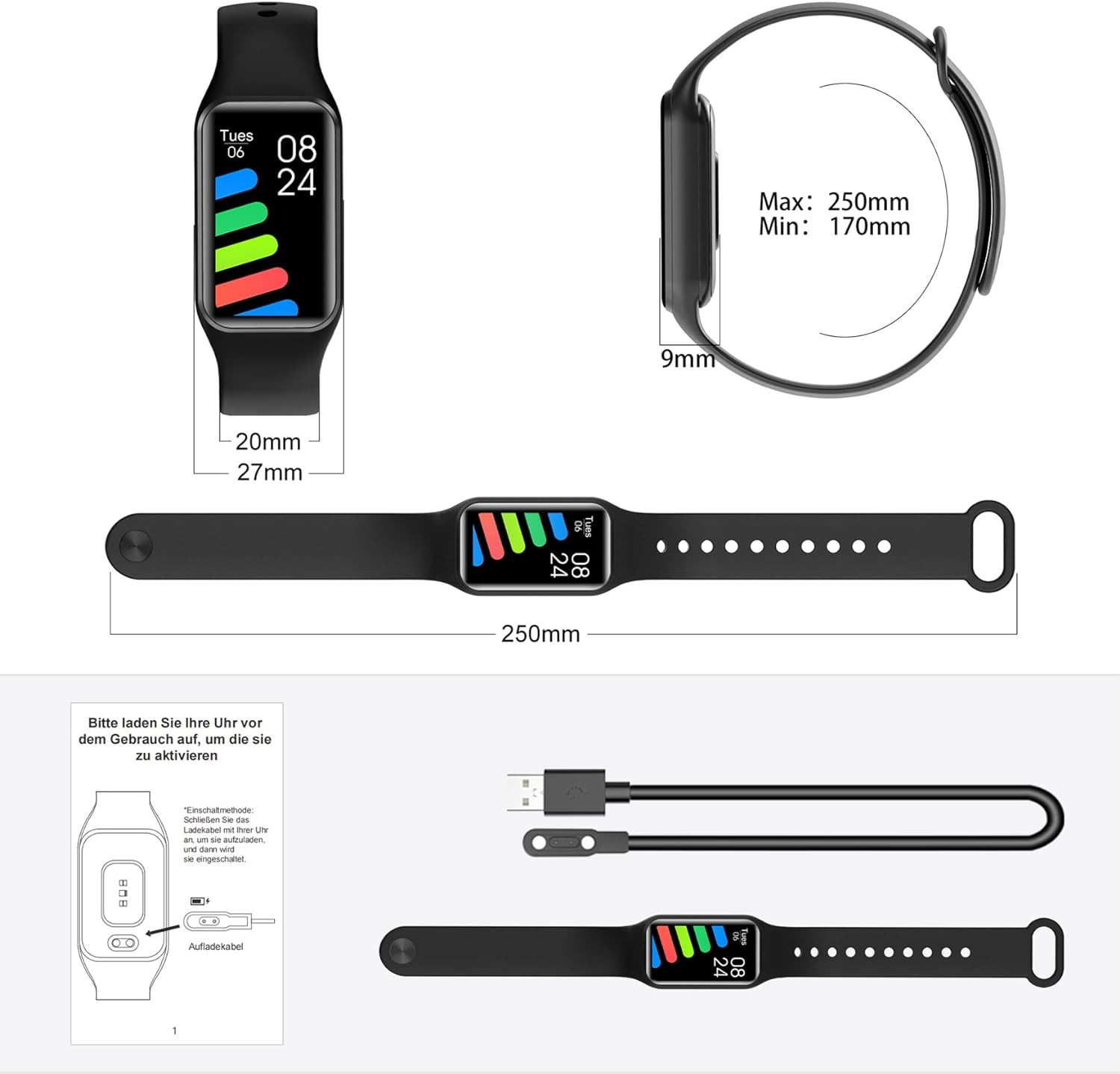 - 【Kompatibilität und Akku】Die Smartwatch ist mit den meisten Android- und iOS-Smartphones auf dem Markt kompatibel. Die Uhr verfügt über einen 180mAh Akku, der ein 2-stündiges Schnellladen unterstützt, die Energie kann für 5-7 Tage verwendet