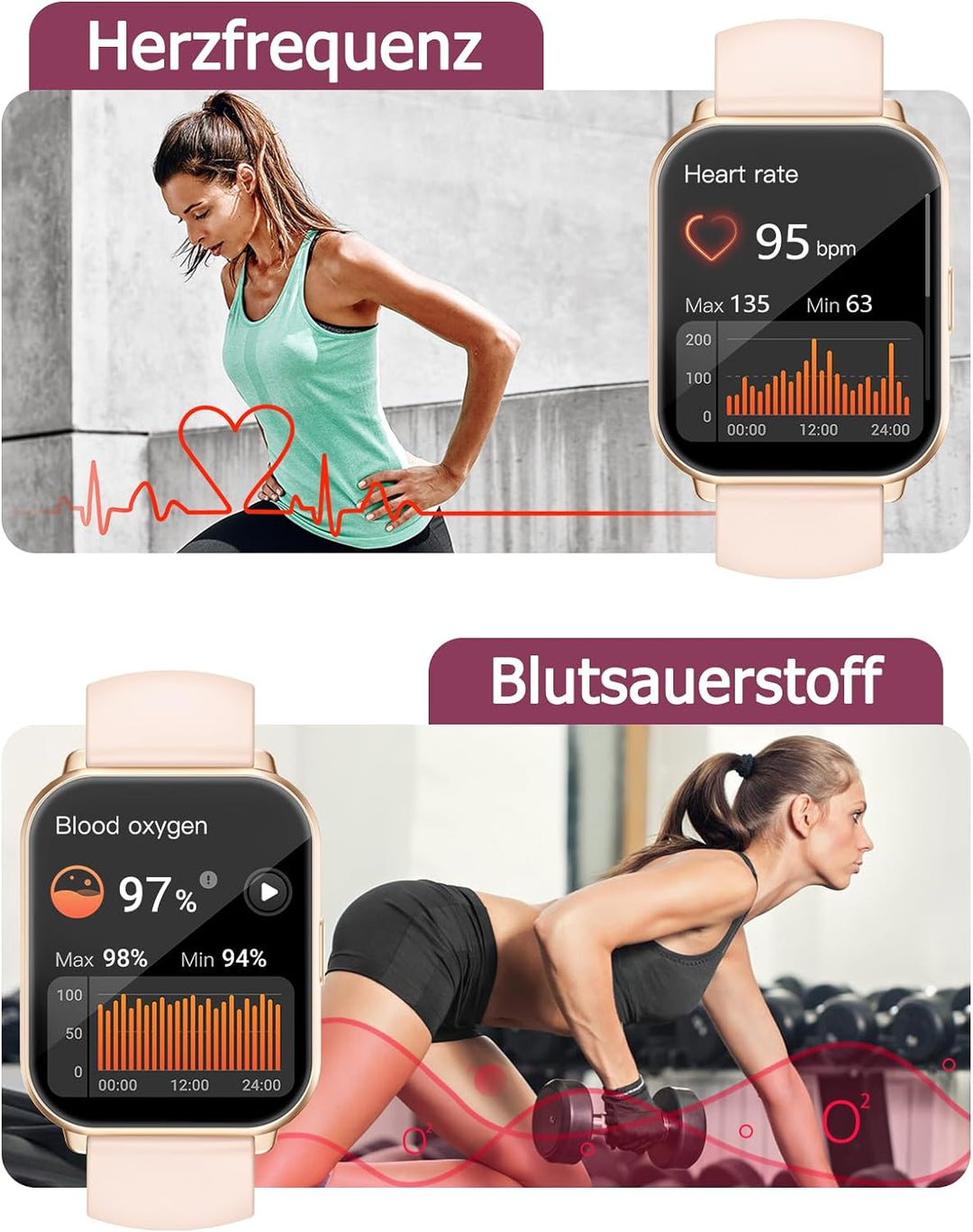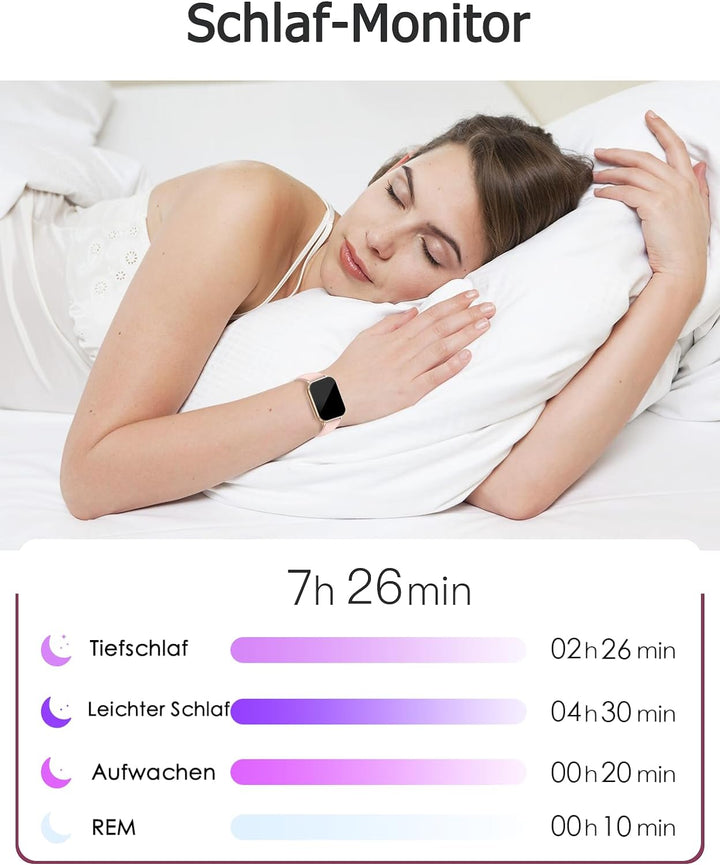 - 🏃【24/7-Herzfrequenzmonitor und Schlafqualitäts-Tracker】 Überwachen Sie automatisch Ihre Echtzeit-Herzfrequenz, Ihren Blutsauerstoffgehalt (SpO2) und verfolgen Sie Ihren Schlaf. Sie bietet eine umfassende Analyse Ihrer Schlafqualität, einschliesslich Tiefschlaf, Leichtschlaf und Aufwachzeit und kann Ihnen helfen, Ihre Gesundheit zu verstehen und Ihren Lebensstil angemessen zu ändern.