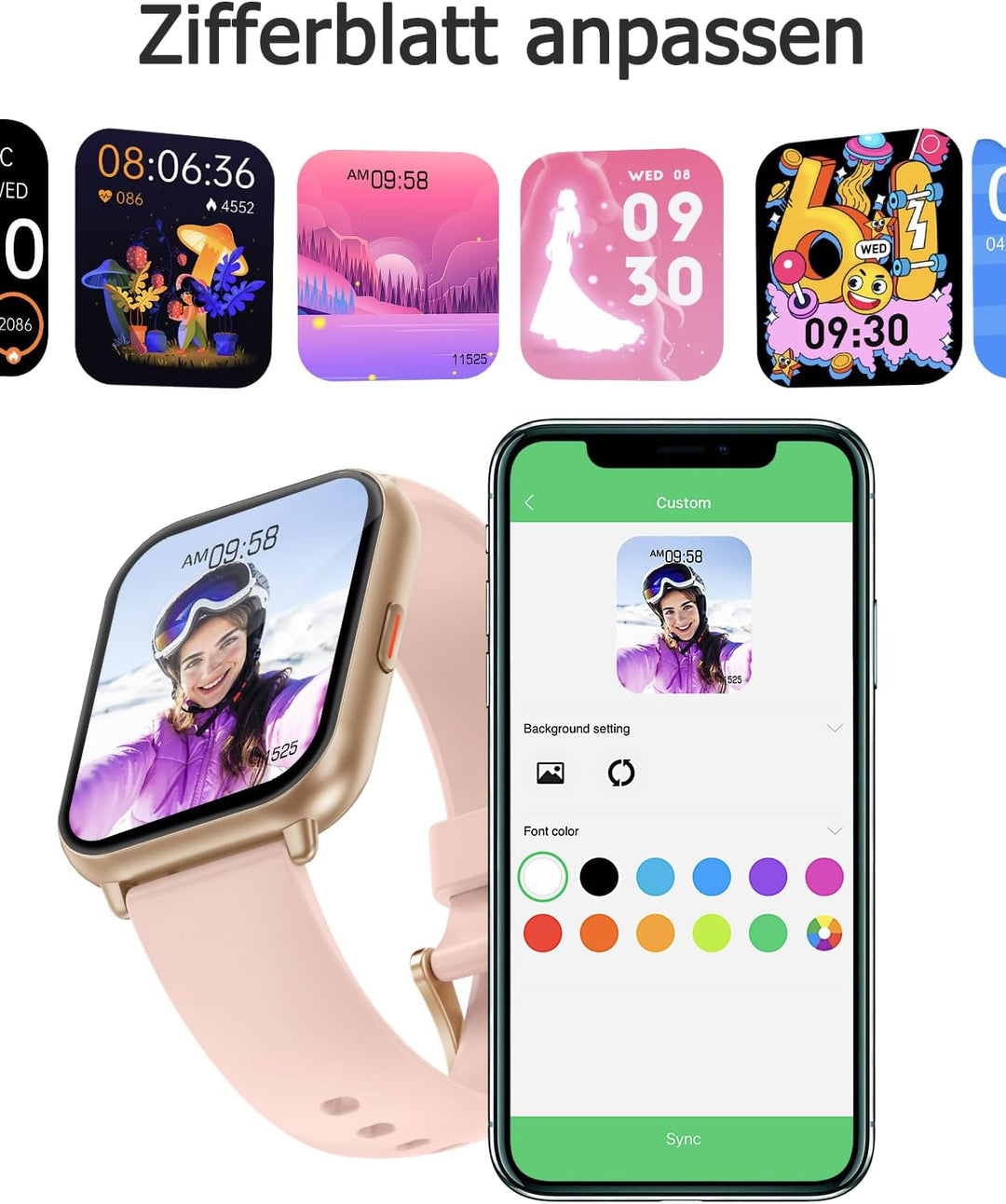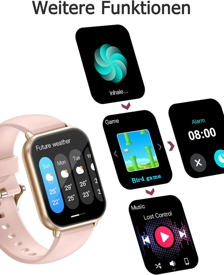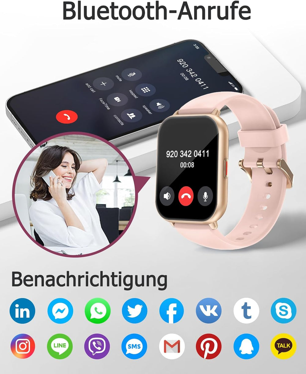 - 💌【Intelligenter Alarm und weitere praktische Tools】Überprüfen Sie eingehende Anrufe und Nachrichten über die Grossbild-Smartwatch (HINWEIS: Kann keine Anrufe entgegennehmen oder auf Nachrichten antworten.) Beinhaltet andere nützliche Funktionen wie Alarm, Remote-Kamera, Musiksteuerung, finden Sie Ihr Telefon, Bewegungserinnerung, weibliche Gesundheit, Stoppuhr, Wetter, Taschenlampe usw. Sie können auch das Zifferblatt anpassen und Ihren eigenen Stil erstellen.