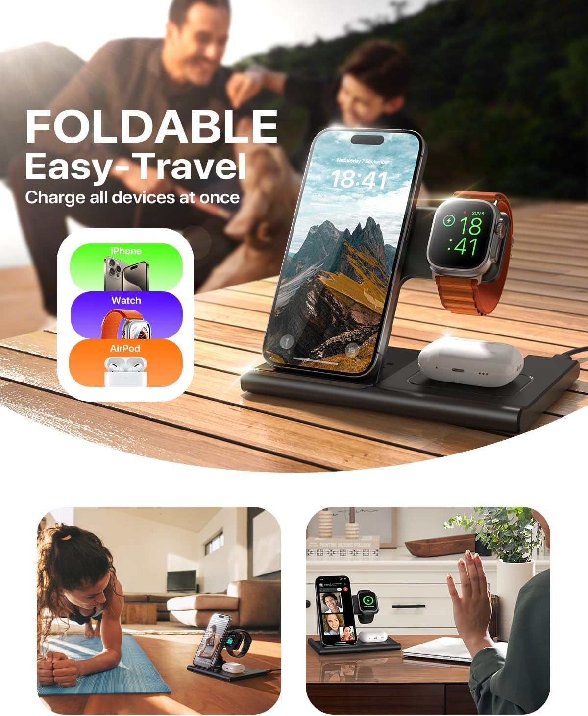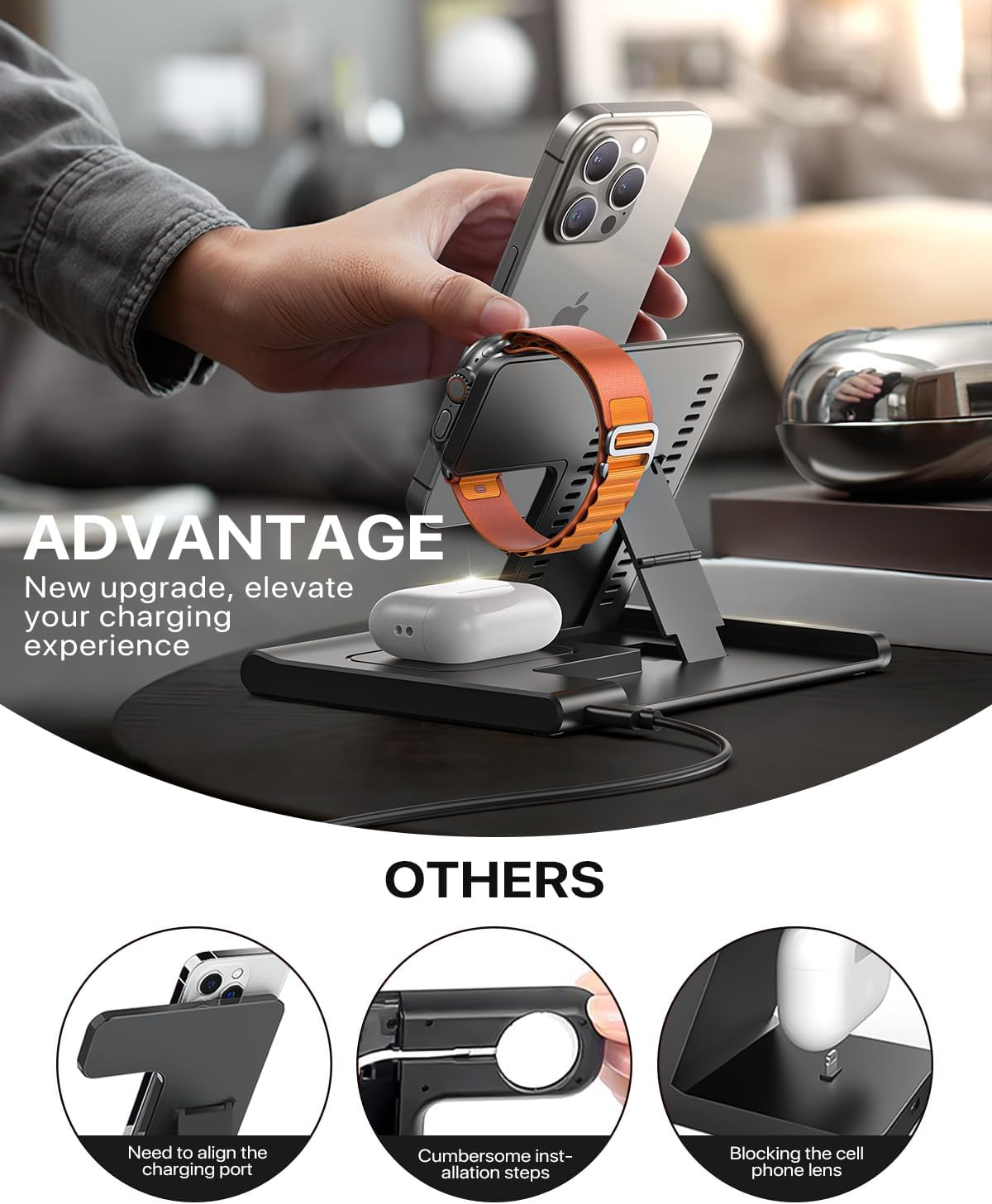 - 3 in 1 Induktion Ladegerät Dies ist eine All-in-One kabellose Ladestation für mehrere Geräte. Maintet, nur ein kabelloses Ladegerät für iPhone 15/14/13/12/11/X/XR/8 & Mini/Plus/Pro/Pro Max Series, funktioniert auch mit anderen Android-Telefonen,