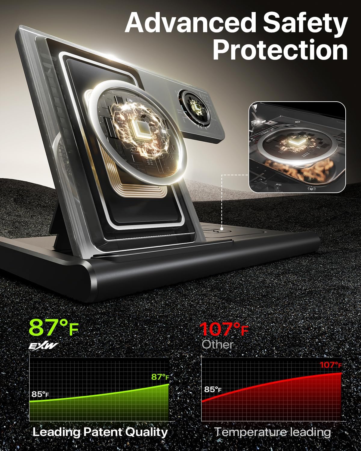 - Schnelles kabelloses Ladegerät Alle Ladebereiche dieser Ladestation wurden mit drahtlosen Ladespulen aufgerüstet, keine Notwendigkeit zum Einstecken, einfach platzieren und aufladen. Obwohl es sich um ein vollständig kabelloses Laden handelt, kann die