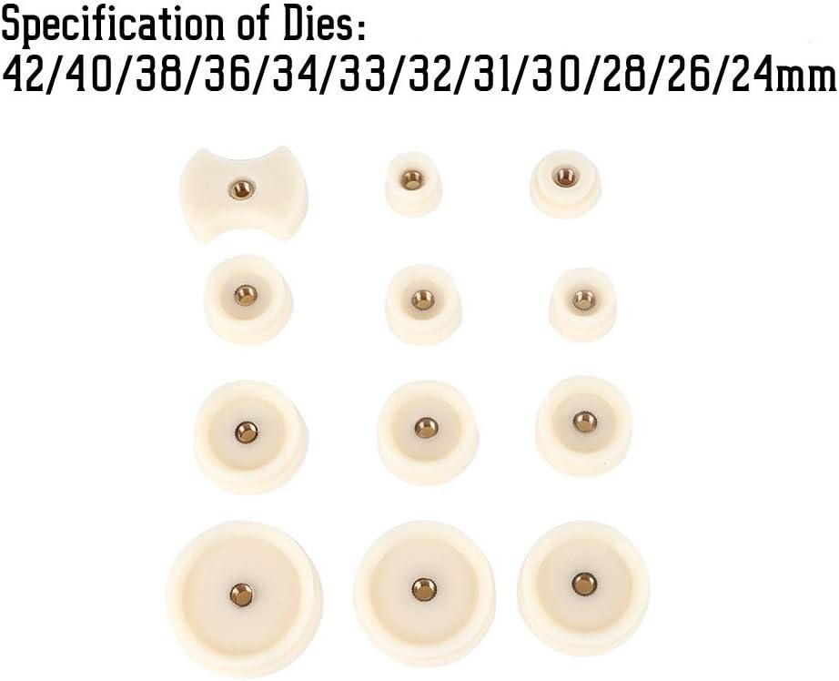 - SIZE OF WATCH PRESS TOOL: Approx. 105 * 85 * 45mm / 4.13 * 3.34 * 1.77inch. Specification of Dies: 42/40/38/36/34/33/32/31/30/28/26/24mm.