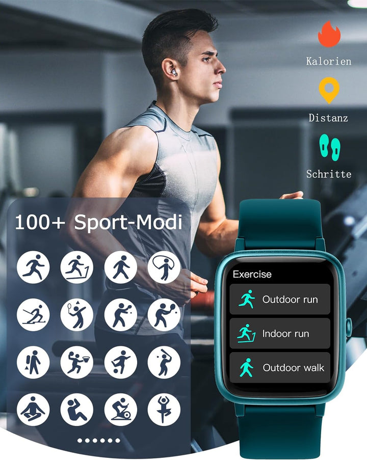 - ★ [ 100+ Sportmodus und tägliche Aufzeichnung] Die Fitnessuhr verfügt über 100+ verschiedene Sportmodi, die alle Ihre Anforderungen an Sport im Innen- und Aussenbereich erfüllen. Die Smartwatch verwendet hochpräzise Bewegungssensoren, optimiert