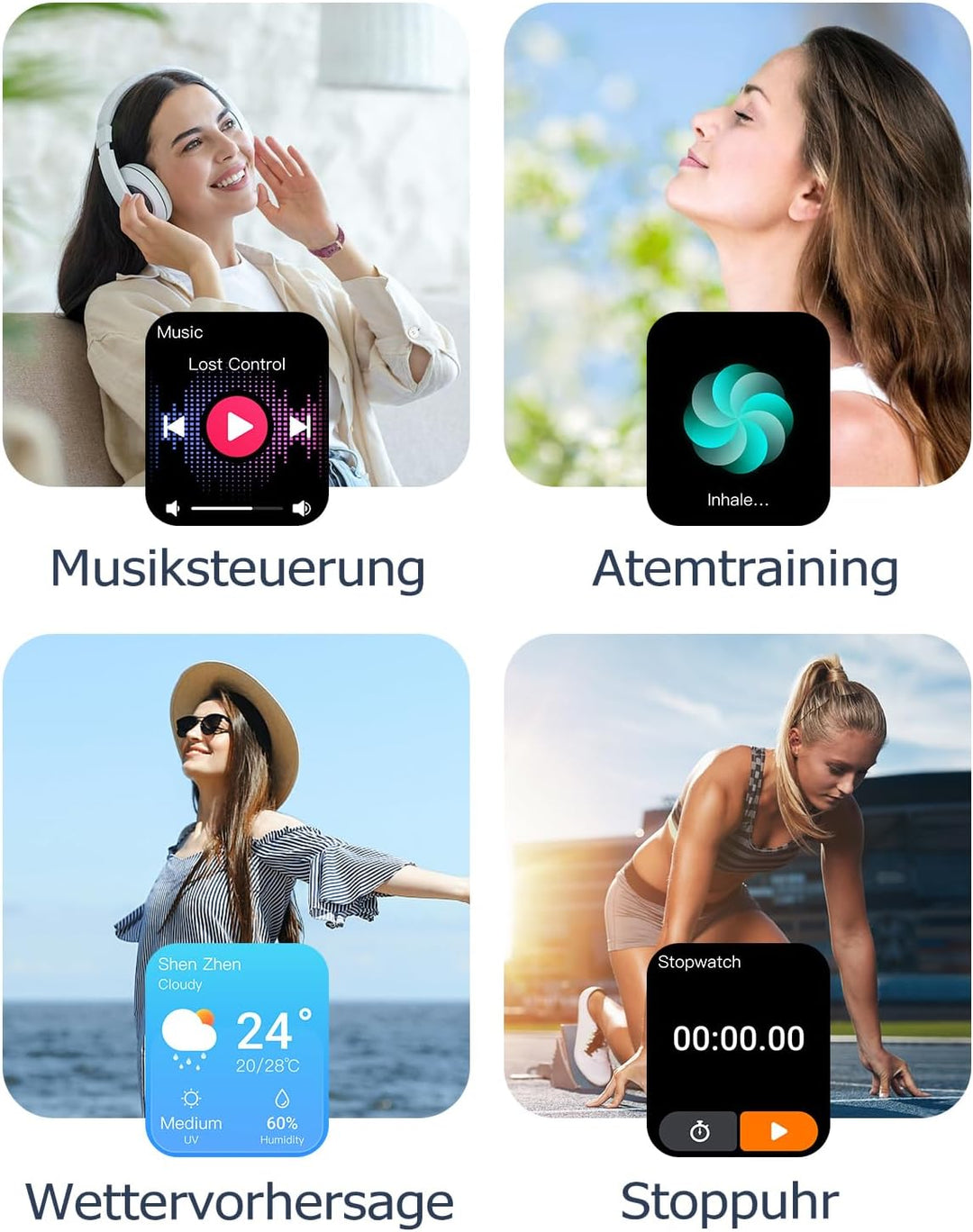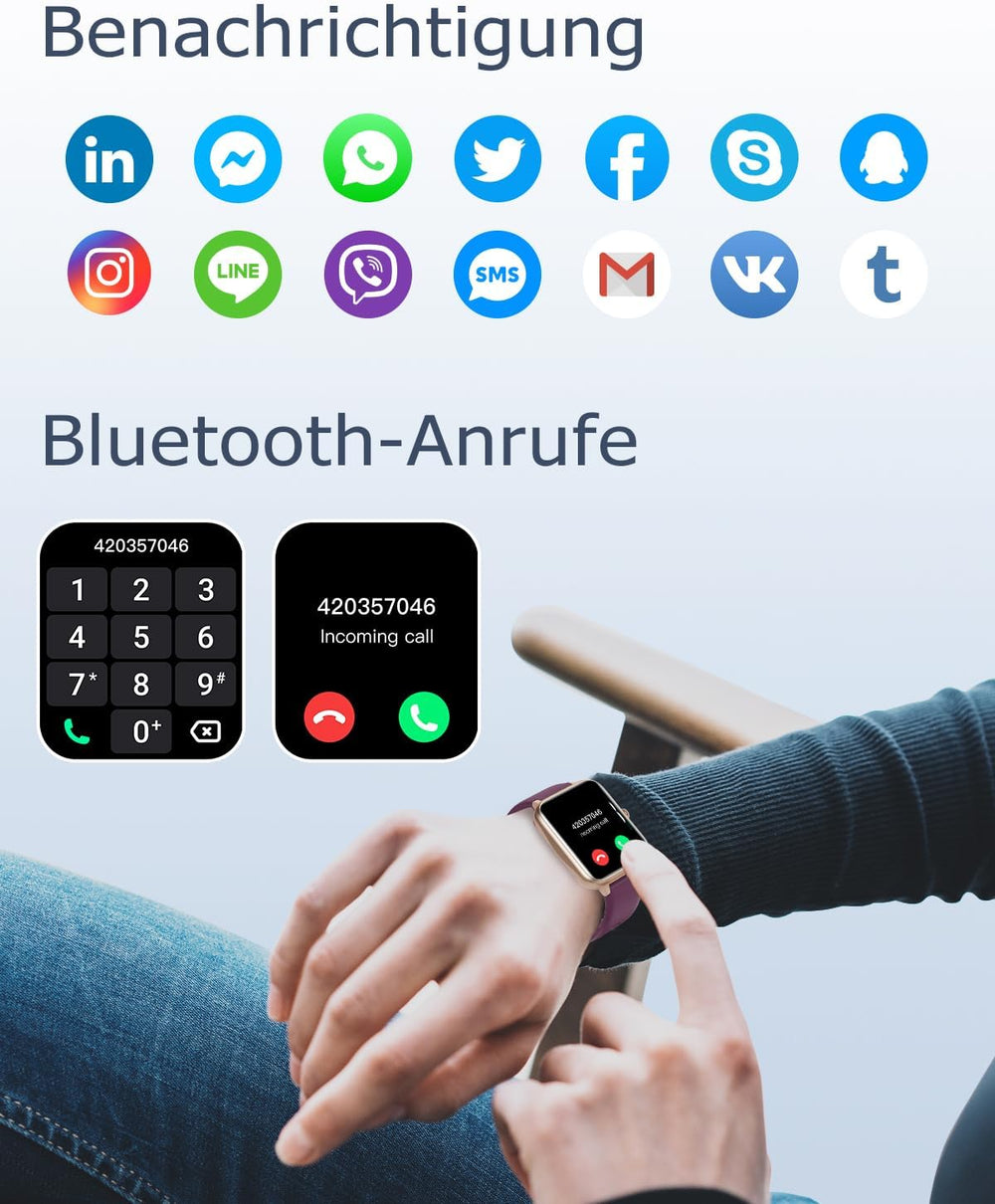 - ★ [ Bluetooth Anrufe & Benachrichtigung ] Nachdem sich die Smartwatch mit dem Mobiltelefon verbunden hat, Sie können Anrufe direkt über die Smartwatch mit klarem Ton tätigen/beantworten, und kann die Smartwatch Anruferinnerungen, Kalender, E-Mails,