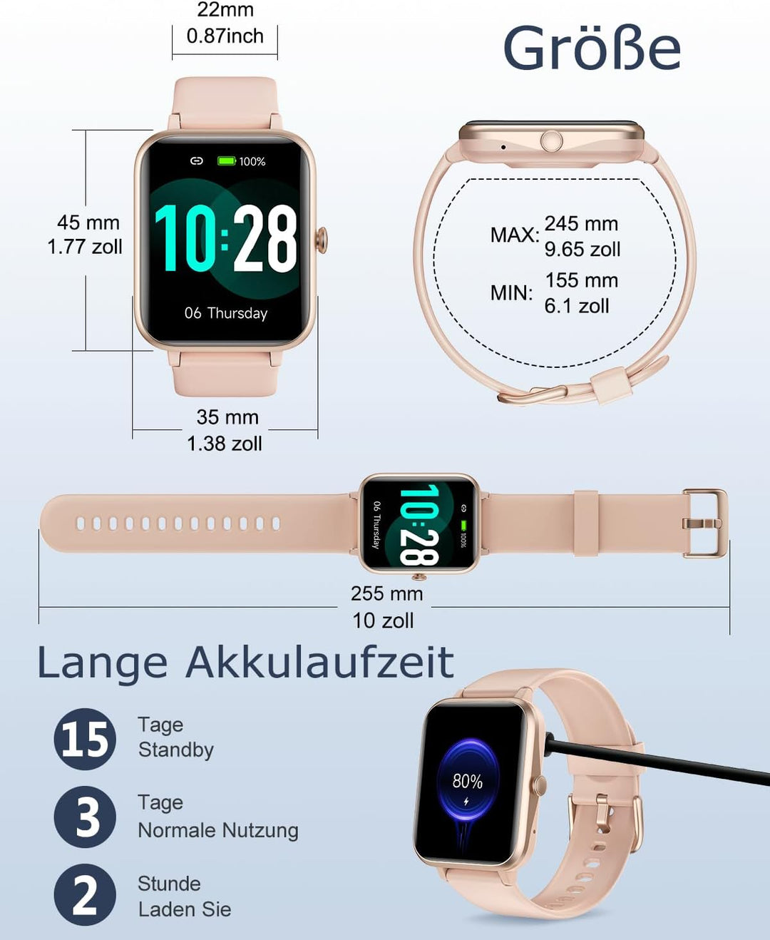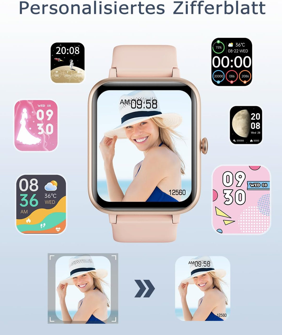 - ★ [ DIY Zifferblatt und Batterielebensdauer ] Die Smartwatch unterstützt benutzerdefinierte Zifferblätter, laden Sie Ihr eigenes Bild hoch oder wählen Sie das Zifferblatt aus der App, die nach verschiedenen Szenarien ausgewählt werden können und