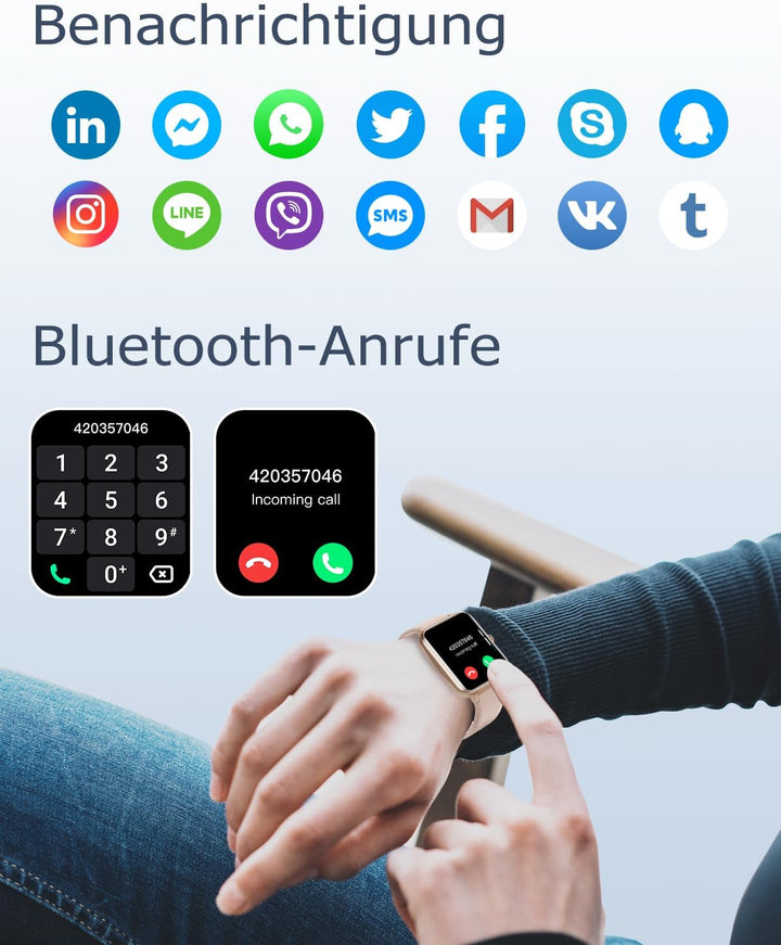 - ★ [ Bluetooth Anrufe & Benachrichtigung ] Nachdem sich die Smartwatch mit dem Mobiltelefon verbunden hat, Sie können Anrufe direkt über die Smartwatch mit klarem Ton tätigen/beantworten, und kann die Smartwatch Anruferinnerungen, Kalender, E-Mails,