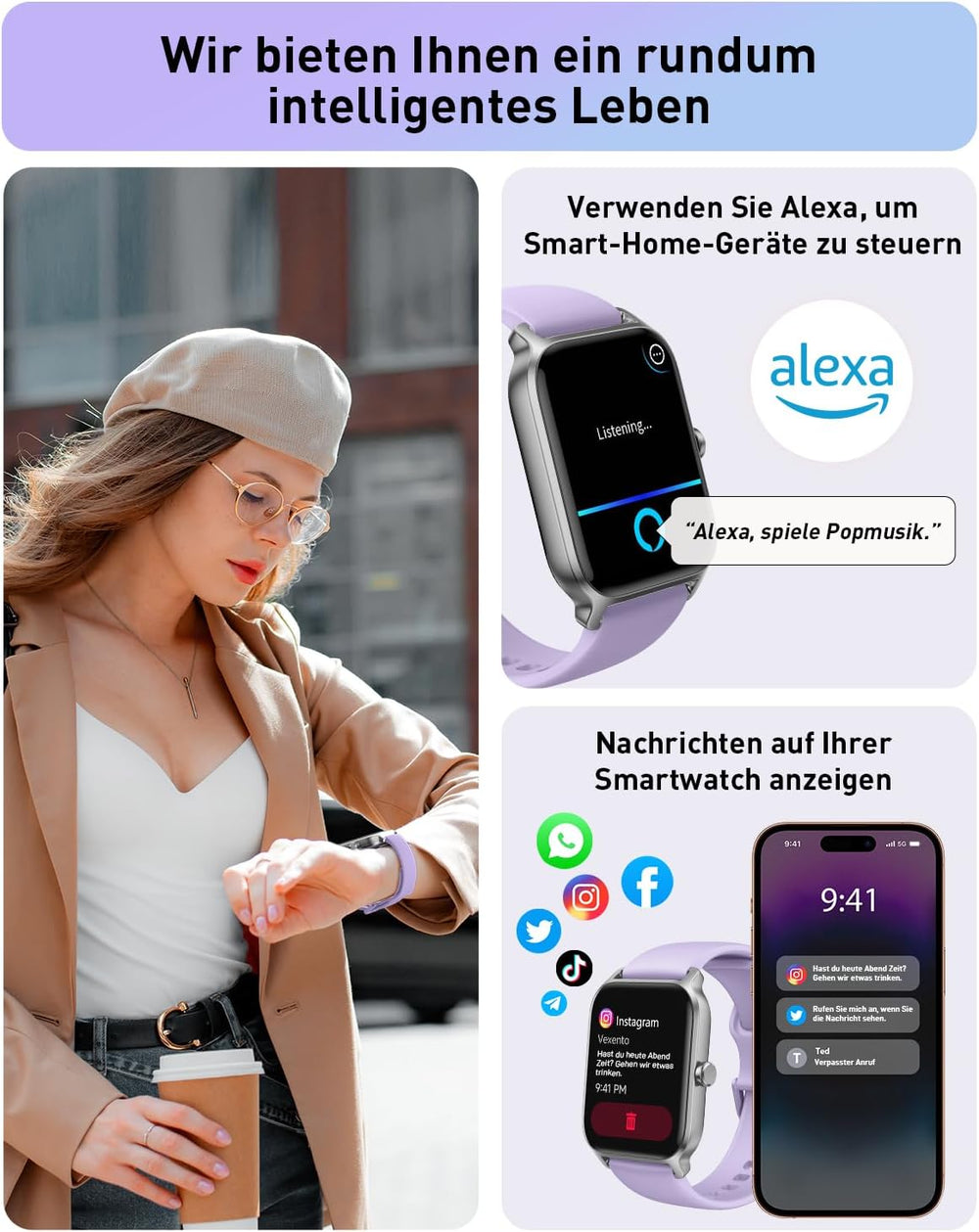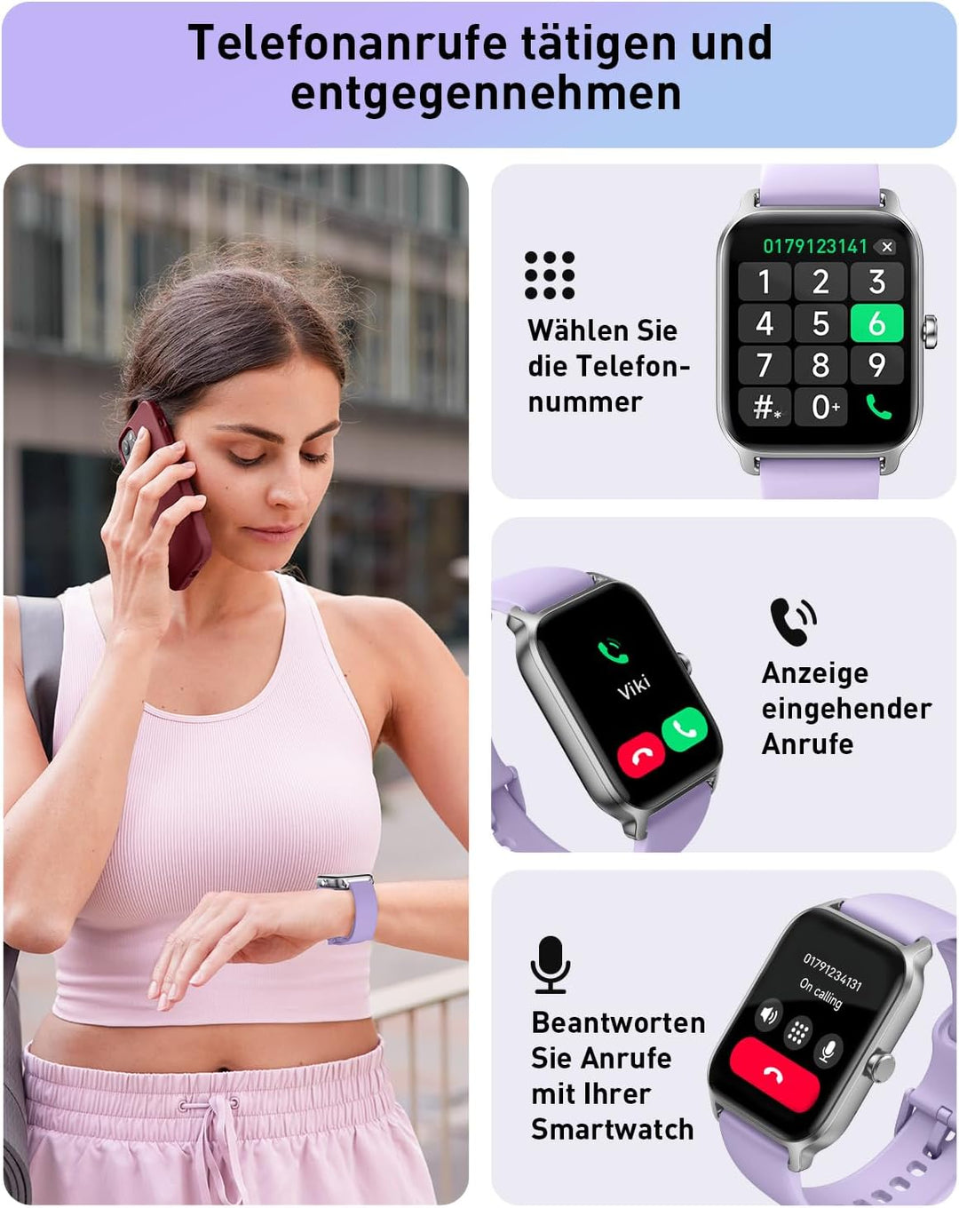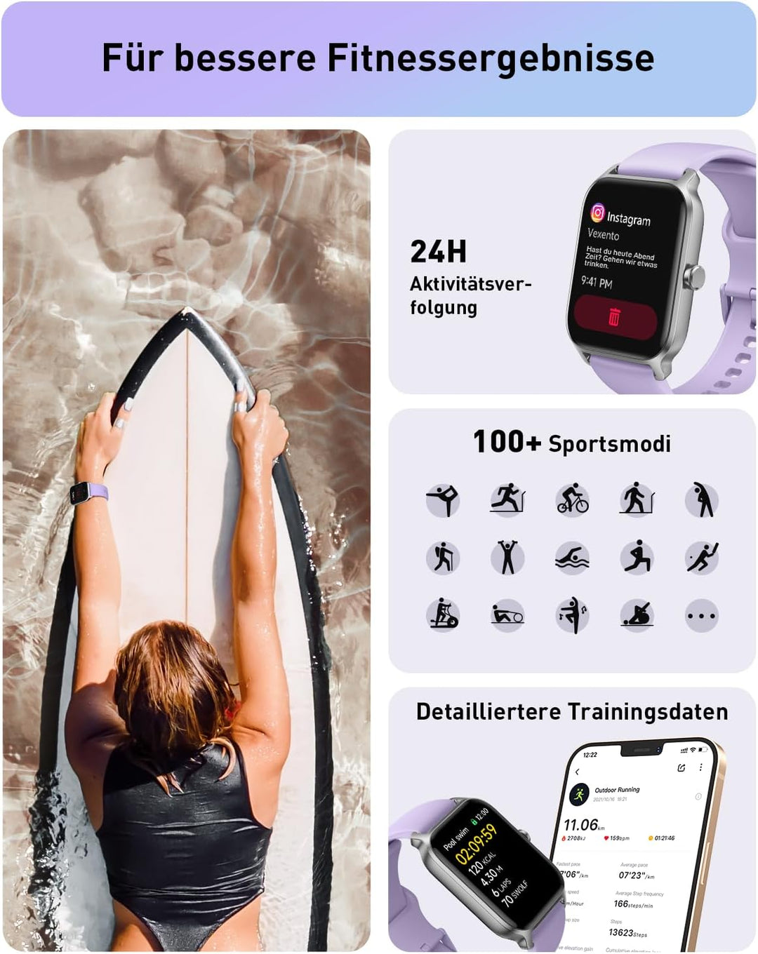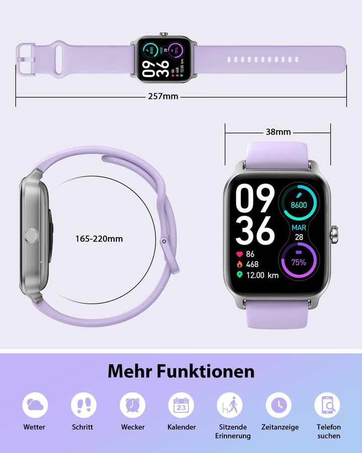 - 🏃【100+ Sportmodi&Automatisch erkennen】Diese Fitnessuhr unterstützt 100 Sportmodi wie Gehen, Laufen, Yoga, Radfahren, Schwimmen usw.; Sodass Sie Sportdaten (Schritte, Entfernung, Kalorien usw.) auf der Smartwatch visuell ablesen können.Mit