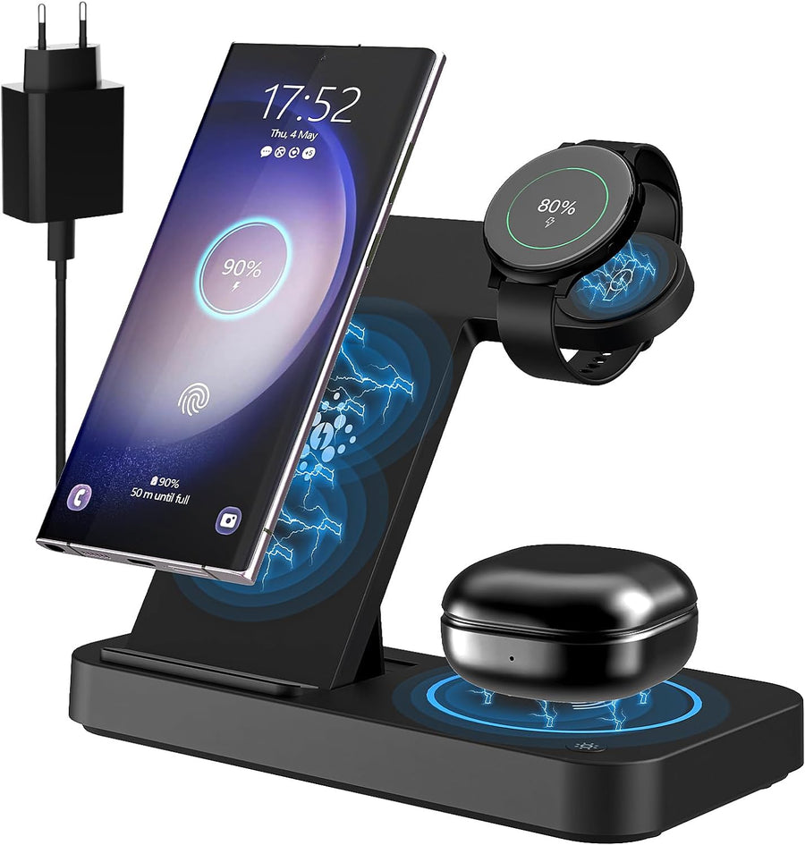 - 🔋⚡[Kabellose 3-in-1 Ladestation]: Die kabellose Ladestation ist die perfekte Lösung, um alle Ihre Samsung-Geräte aufzuladen und an einem praktischen Ort aufzubewahren. Legen Sie sie einfach auf die Ladefläche und geniessen Sie schnelles