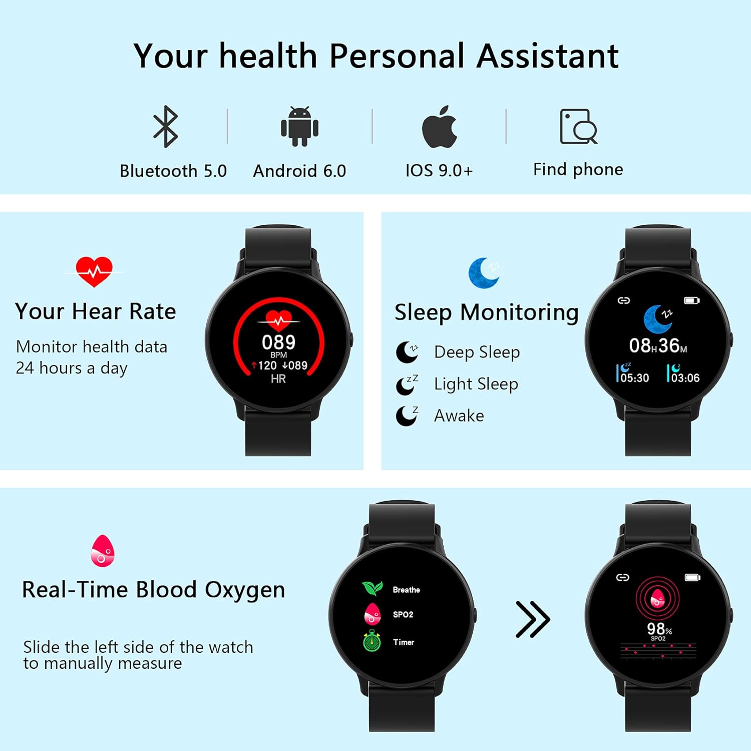 - 【24x7 Herzfrequenz- und Schlafüberwachung】 Die Bluetooth-Uhr überwacht automatisch die 7x24 Herzfrequenz. Erstellen Sie Ihr eigenes Herzfrequenzprofil. Verfolgen Sie Ihre Schlafphasen. Erwerben Sie Ihre Schlafqualität anhand der leichten und