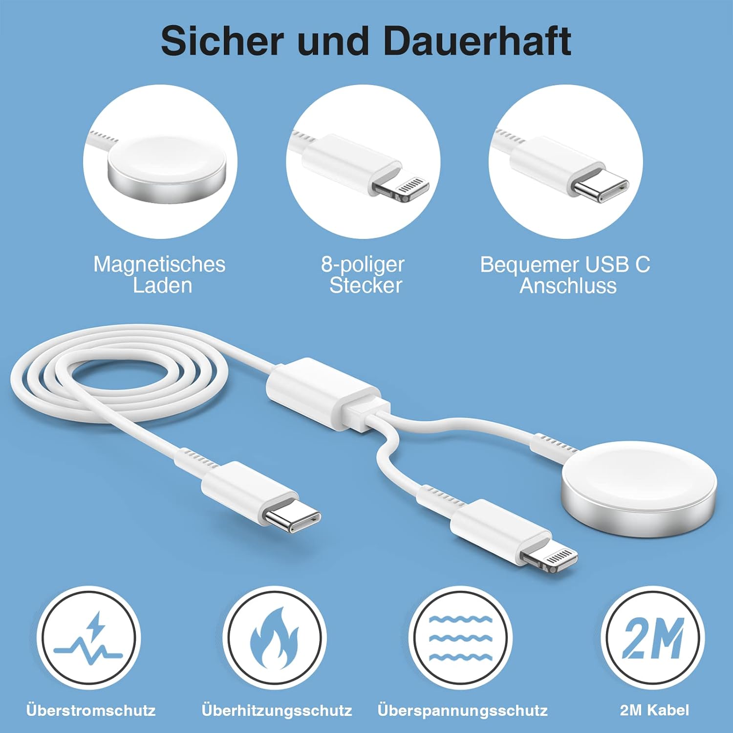 - 【2M Kabel】 2-in-1 iPhone und iWatch Ladekabel mit dem ursprünglichen MFI -Chip und integriert ist aus hochwertigem ABS+ PC und reinem Kupferdraht, es wurde über 10.000 Mal Biege getestet, um zu vermeiden, dass die Verkürzung der Kürzung ist Leben
