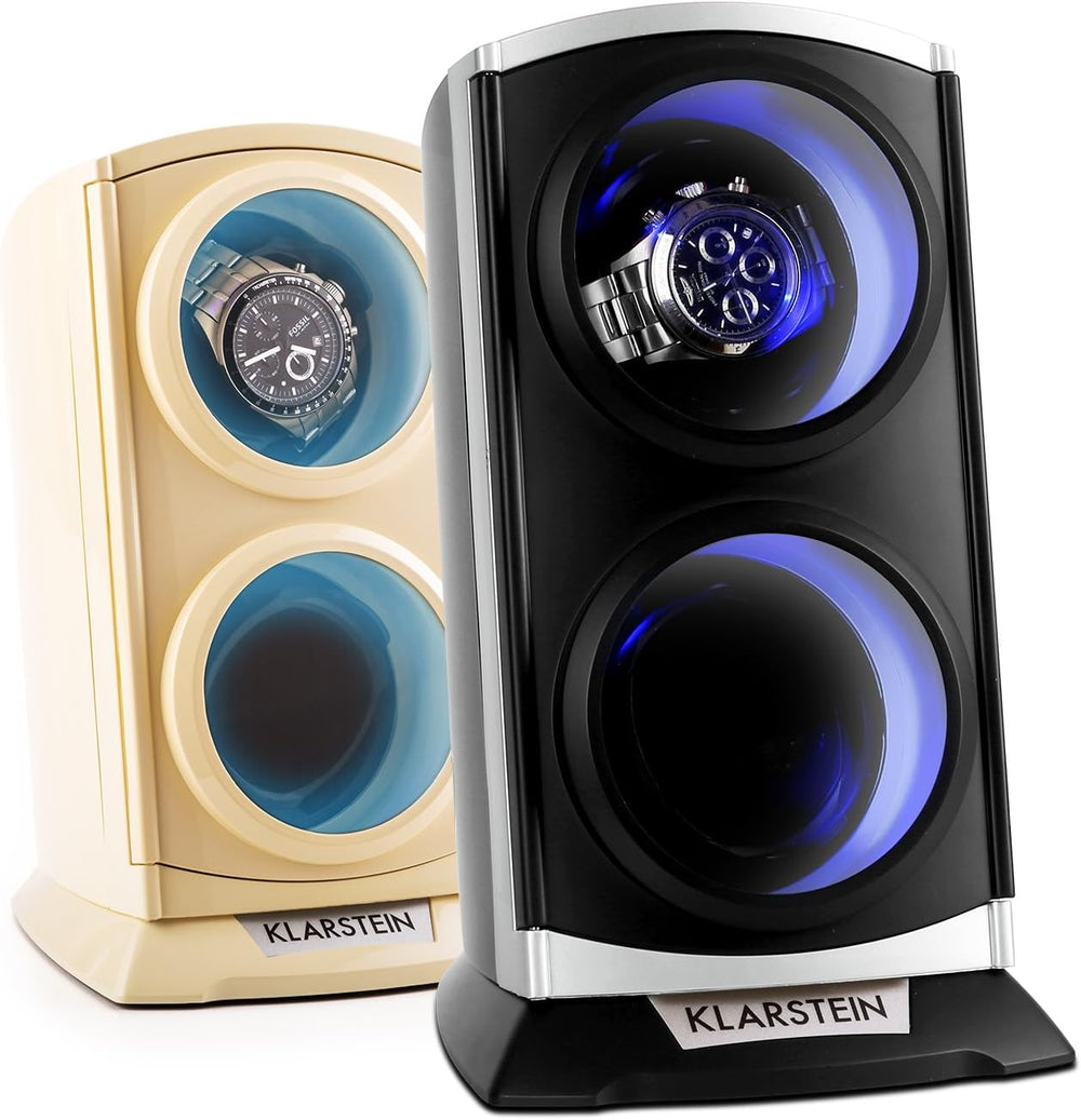 PRODUKTBESCHREIBUNGEN Klarstein Uhrenbeweger, leiser Automatik-Uhrenbeweger, Watch Winder, Uhrenbeweger für Automatikuhren, automatischer Uhrenbeweger, Platz für 2 Uhren, LED Beleuchtung, 3 Drehmodi, 4 Rotation Unser automatische Uhrenbeweger von Klarstein simuliert die alltägliche Tragebewegung deiner Automatikuhr am Handgelenk und zieht diese durch Rotationsbewegungen auf. So bleibt die Automatikuhr auch dann in Betrieb, wenn du sie eine Zeit lang nicht getragen hast. Der Automatik Uhrenbeweger ist für 2 Uhren geeignet und hat 4 verschiedene Rotationsprogramme. Leise konstruierter Uhrendreher Dieser Watch Winder verfügt über einen flüsterleisen Motor, den du kaum hören kannst. In Verbindung mit einem Getriebe im Inneren des Uhrenbewegers sorgt dieser für einen extrem leisen Betrieb. Du kannst den Uhrenbeweger überall aufstellen und jederzeit benutzen, insbesondere im Schlafzimmer und im Büro. Mit verschieden Betriebsmodi Dieser Uhrenbeweger verfügt über verschiedene programmierbare Betriebsmodi, mit denen du die Zeit und die Richtung einstellen kannst. Der Uhrenbeweger kann dank der Drehung im und gegen den Uhrzeigersinn in beide Richtungen gedreht werden. Ausserdem hat das mattschwarze Gehäuse eine blaue LED-Beleuchtung. Bewegung und Pflege zugleich Suchst du ein originelles und sinnvolles Geschenk? Dann ist der Uhrenbeweger für Automatikuhren genau das Richtige. Der Uhrenbeweger passt für die meisten Herren- und Damenuhren mit einer Armbandlänge von 155 - 205 mm. Erspare dir und anderen das mühsame Aufziehen einer Automatikuhr. Die Bewegungen verhindern gleichzeitig, dass das Öl verklumpt. Schönes Design Das grosse Sichtfenster des Uhrenbewegers gibt einen grosszügigen Blick auf die Uhren frei. Das schlichte Design bildet einen schönen, harmonischen Kontrast zu den ausgestellten Uhren. Eigenschaften 4 verschiedene Programme Arbeitstemperatur: 5 bis 40 °C geeignet für folgende Armbandlängen: 155 - 205 mm rutschfeste Gummifüsse Strom: via 4V, 5A Netzteil