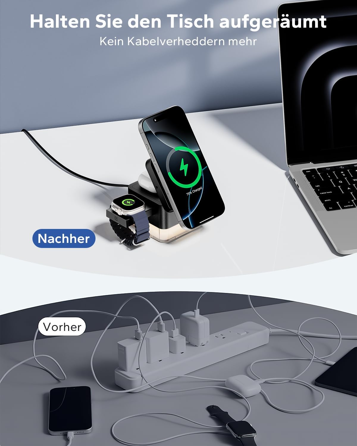 - Umfassende Kompatibilität: Dank verbessertem Smart-Chip 3.0 ist die MagSafe Ladestation kompatibel mit iPhone 17/16/15/14/13/12/ Air/Pro/Pro Max/Plus/Mini, Apple Watch Series 2–11/SE/Ultra sowie AirPods 2/3/4/Pro/Pro 2 (Hinweis: AirPods 2/3/4 nur mit