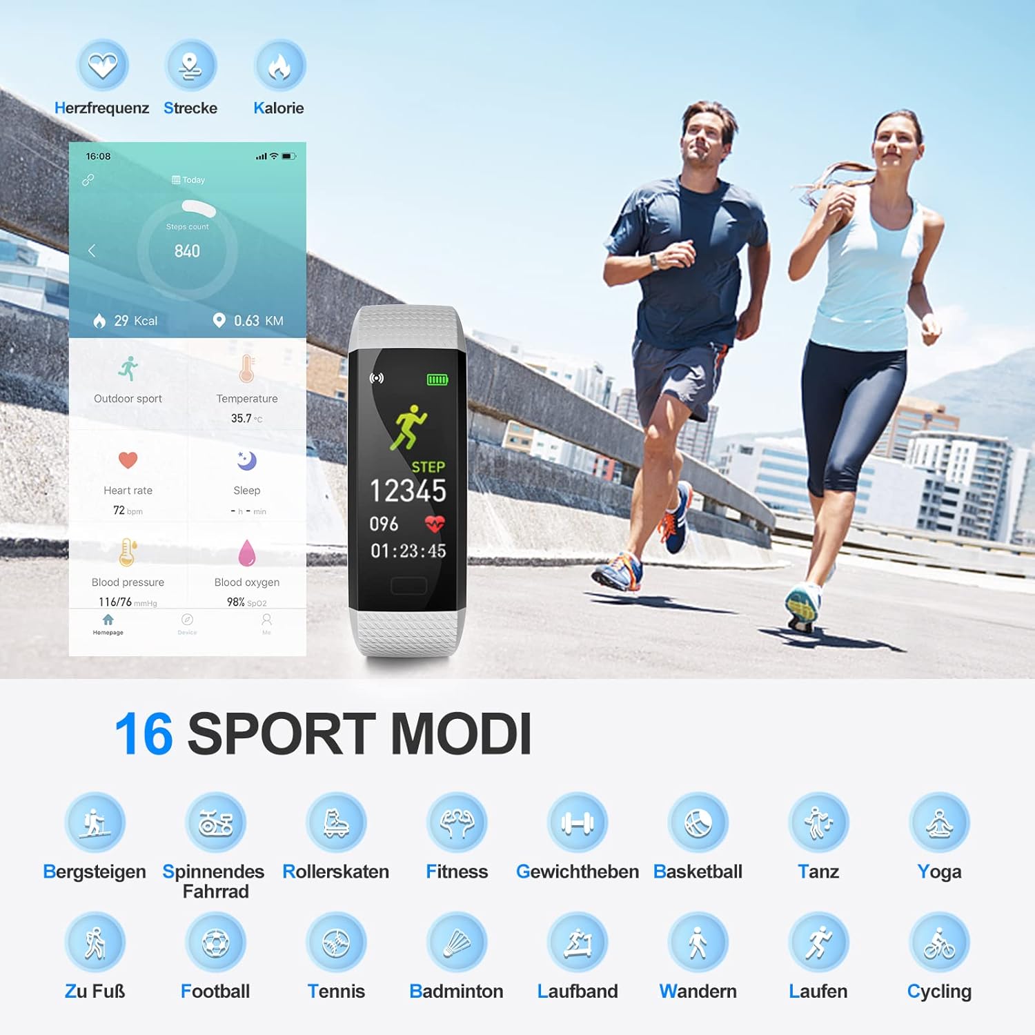 - ► Bewegung ist unter Ihrer Kontrolle – Der Sportuhr zeichnen Ihre Trainingsdaten genau auf. Zum Beispiel die Anzahl der Schritte, die zurückgelegte Strecke, die verbrannten Kalorien, Zeit der Ausübung und Ihre wöchentlichen/monatlichen Daten.