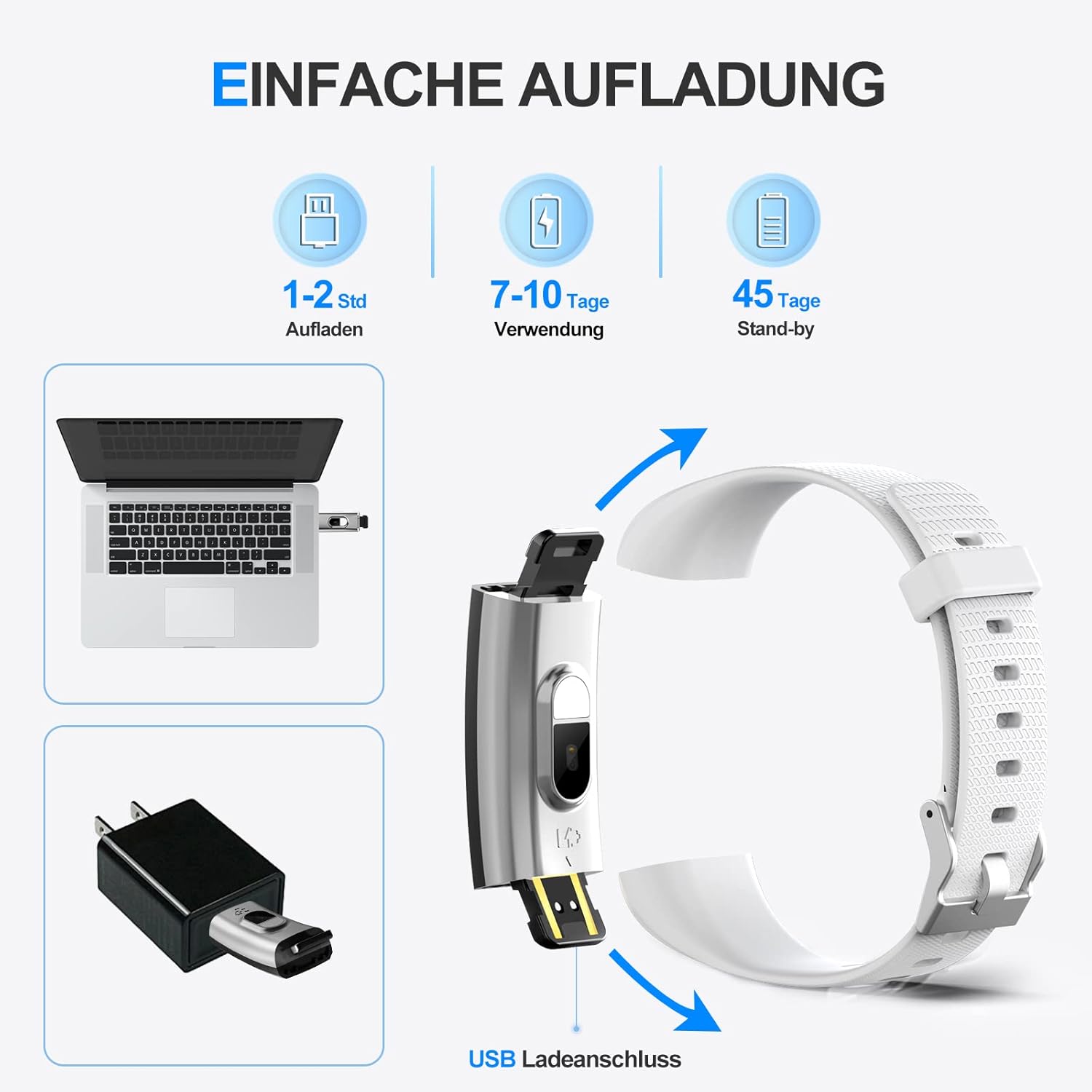 - Eine lange Akkulaufzeit und leichtes Aufladen – Eingebaute USB-Ladeschnittstelle & Eine lange Akkulaufzeit. Ziehen Sie den oberen Teil des Armbandes ab, dort liegt ein USB-Verbindungsstück. Diesen können sie in jeden Standard USB-Port stecken um die